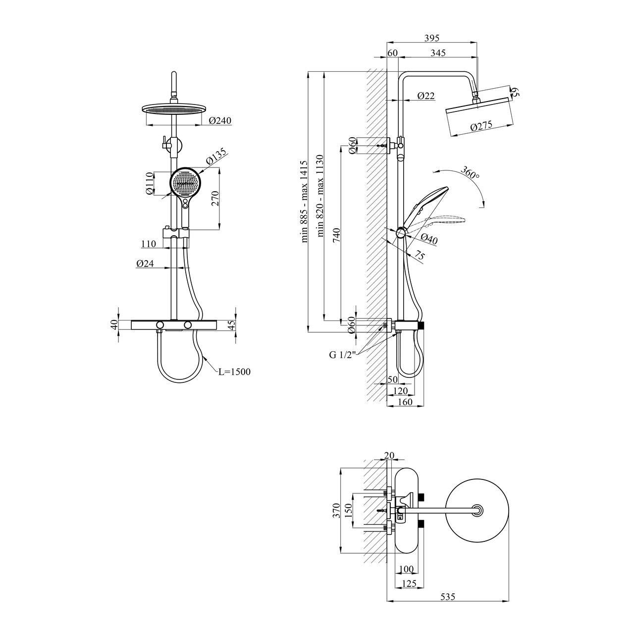 Одним из преимуществ данной модели является регулируемая высота душевой стойки от 820 до 1130 мм, что позволяет настроить её под рост и потребности каждого пользователя.