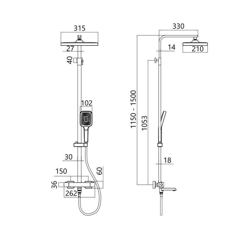 Диаметр лейки, ммРучной душ: 102х110. Верхний душ: 315х210