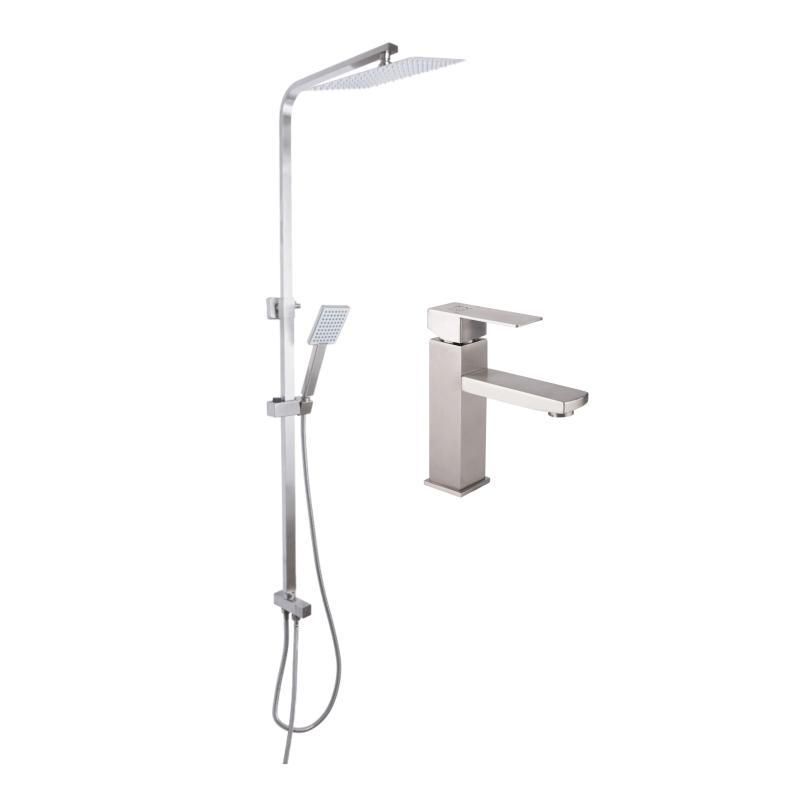 Комплект из смесителя для раковины и душевой стойки серии Kubis. Отличается современным дизайном и никелевым покрытием, подходящим для практичного обустройства ванной комнаты.