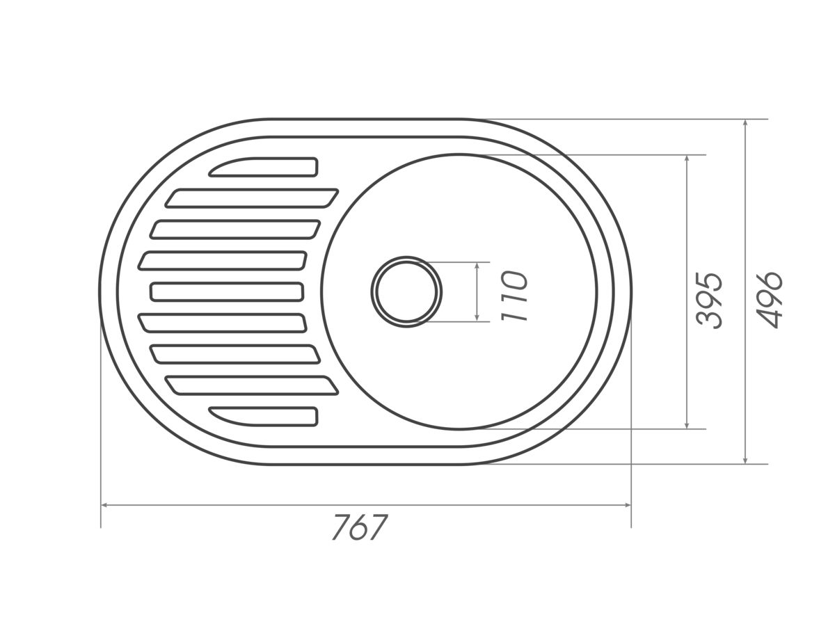 Размеры мойки – 767х496х190 мм, вес – 9,1 кг, сифон - евросифон с широкой горловиной, 110 мм.