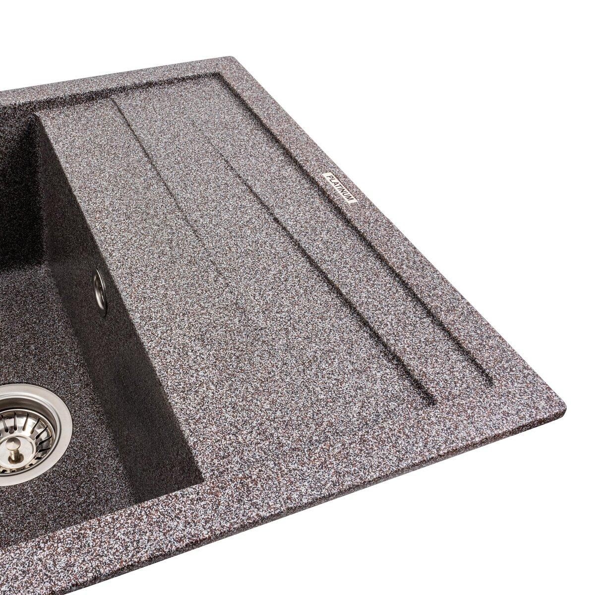 Гранитная мойка для кухни 7050 CASCADA цвета Микс украинского бренда VALESO – это стильная, врезная, прямоугольная мойка, которая своим видом прекрасно дополнит дизайн вашей кухни. Мойка на 80% состоит из кварца и на 20% из очень жесткой акриловой смолы, благодаря чему неприхотлива в уходе, а также имеет большой запас прочности.