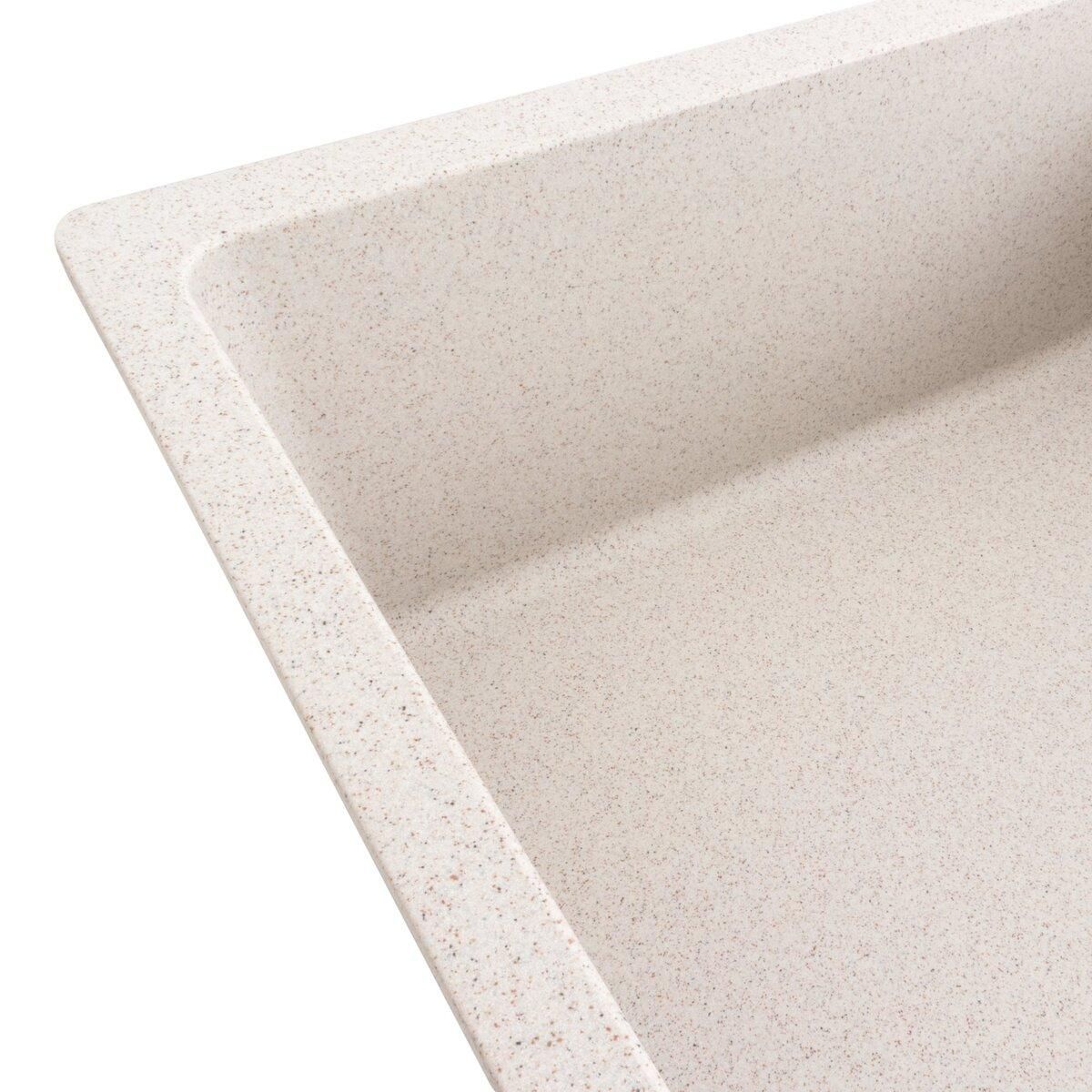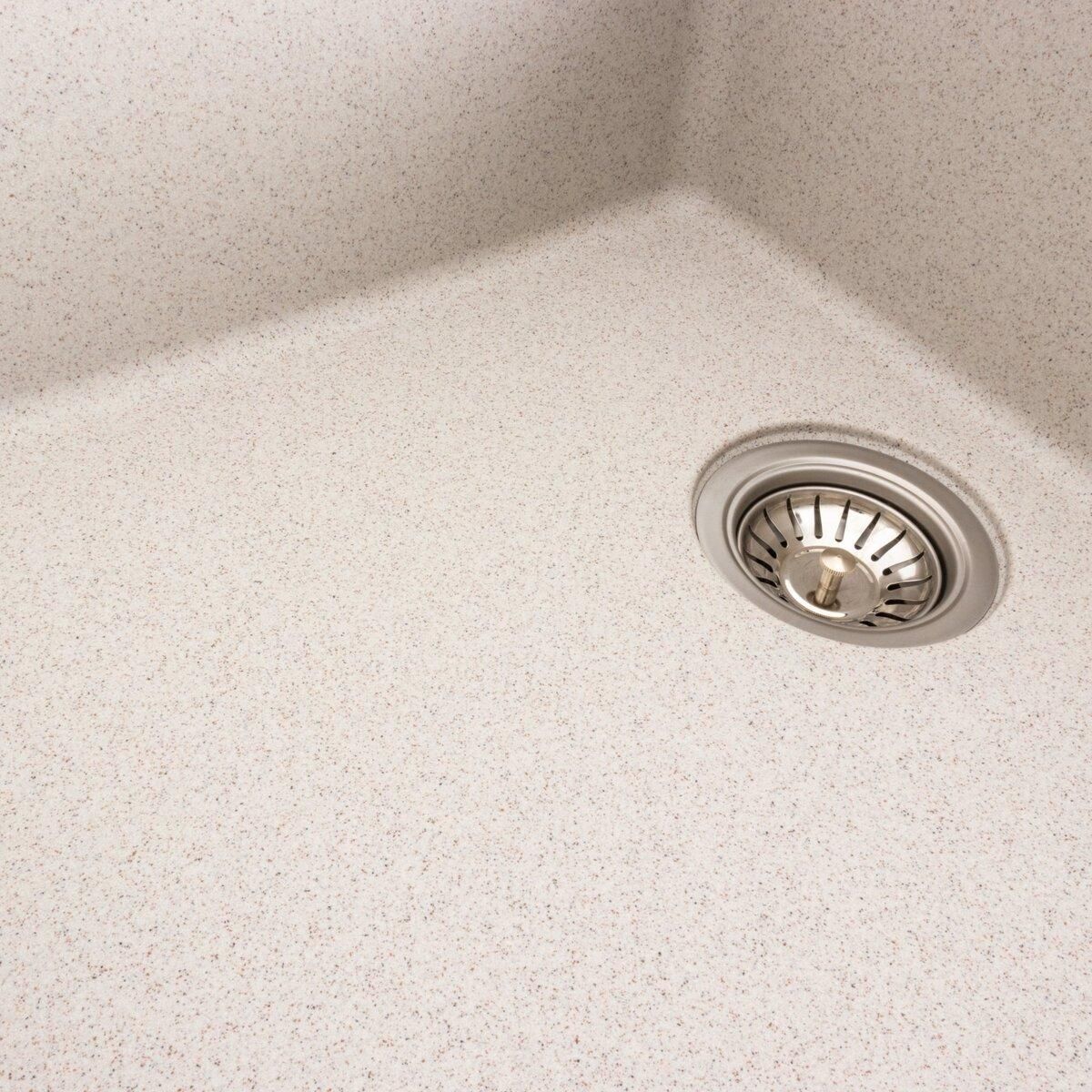 Мойка на 80% состоит из кварца и на 20% из очень жесткой акриловой смолы, благодаря чему неприхотлива в уходе, а также имеет большой запас прочности.