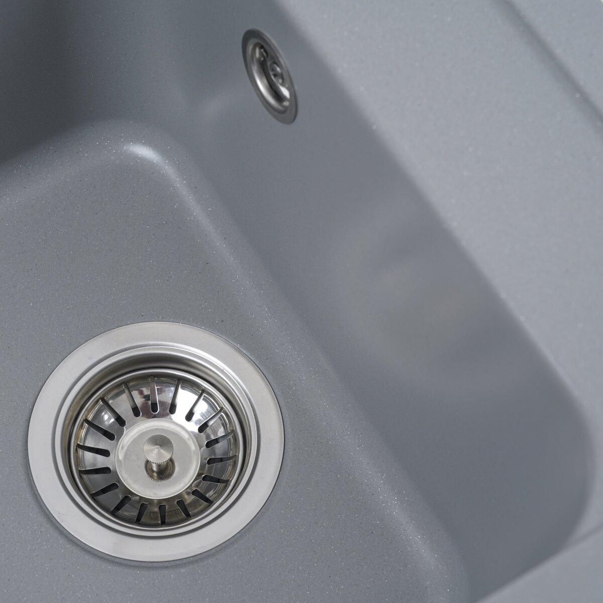 Мойка имеет матовую фактуру и приятный для глаза цвет - серый металлик, что позволяет ей легко вписаться в интерьер кухни.