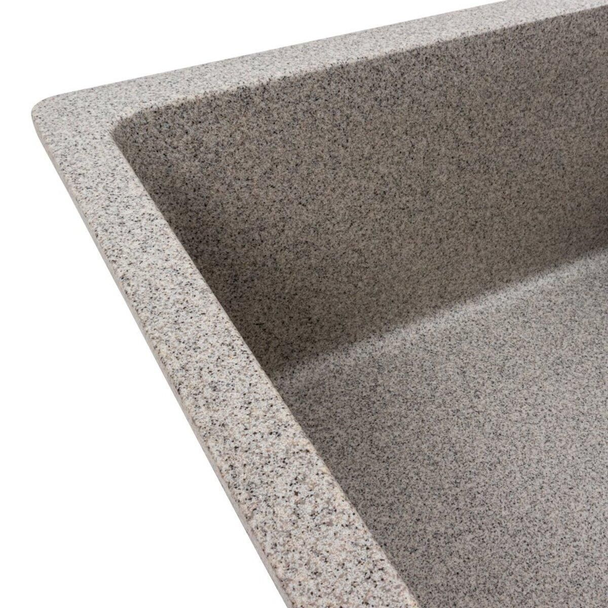 Мойка на 80% состоит из кварца и на 20% из очень жесткой акриловой смолы, благодаря чему неприхотлива в уходе, а также имеет большой запас прочности.