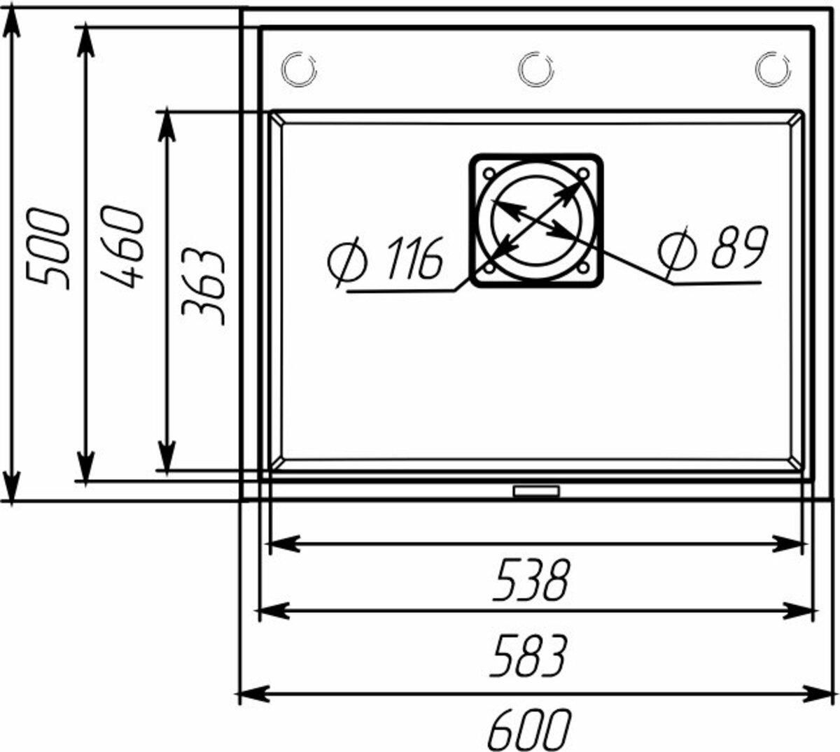 Общие размеры мойки: 600×500 мм