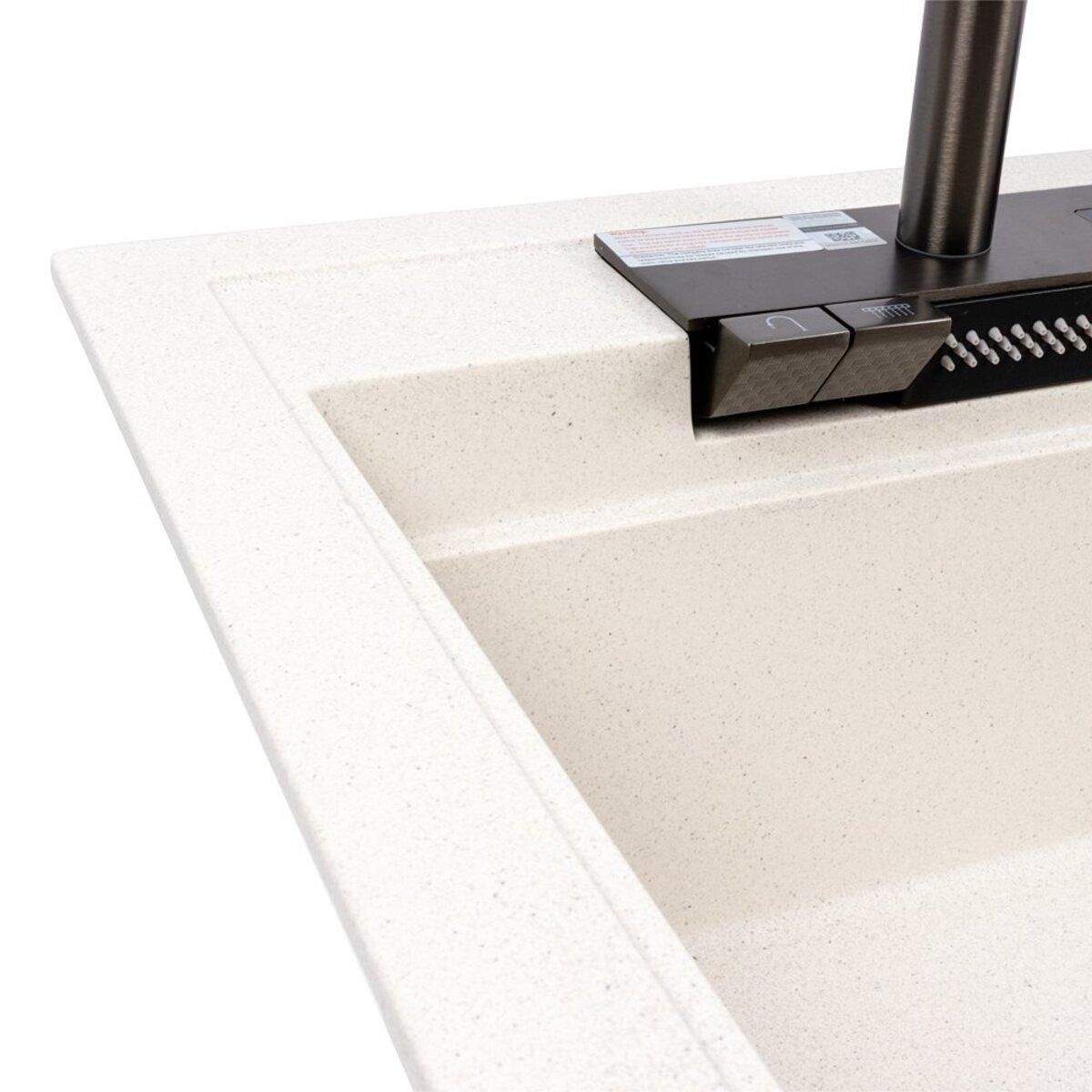 Гранитная мойка VALESO 7950 ATRUM в цвете белый в точку— это удачное сочетание современного дизайна, надёжности и удобства. Она изготовлена из прочного гранитного композита, устойчивого к царапинам, перепадам температур и бытовой химии. Матовая поверхность придаёт изделию элегантный внешний вид и легко очищается.