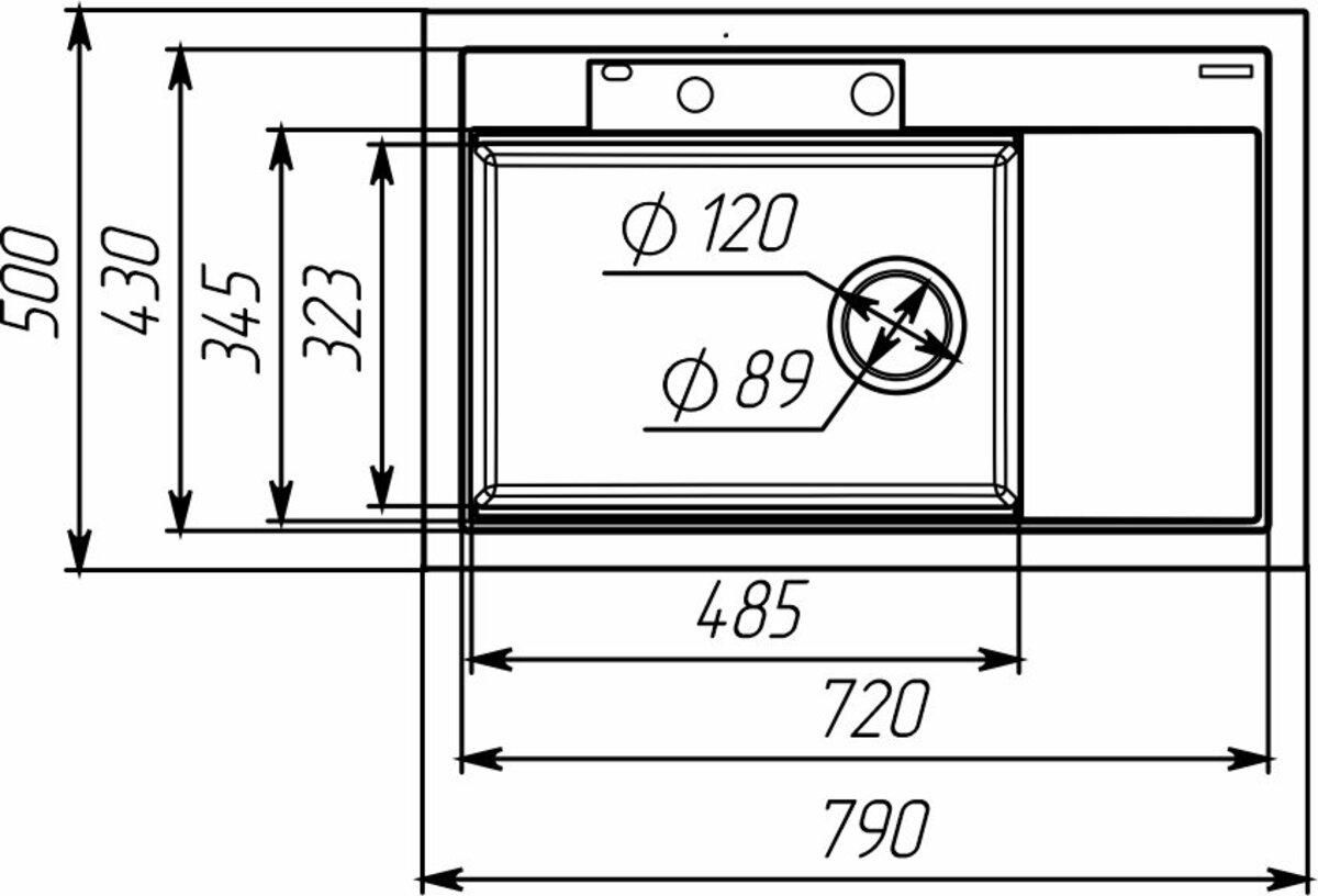 Мойка оснащена одной вместительной чашей глубиной 200 мм, которая отлично подходит для мытья крупной посуды и продуктов. Также предусмотрена удобная зона сушки. Общий размер — 790×500 мм, что делает модель универсальной для большинства кухонных гарнитуров.