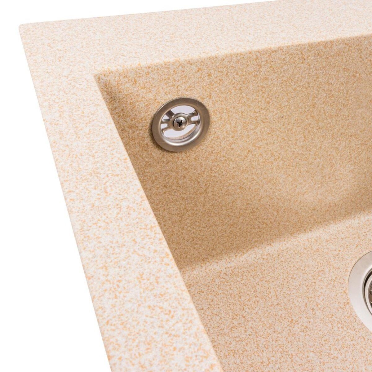 Размер мойки — 500×500 мм, глубина чаши — 200 мм, что обеспечивает комфортное использование даже при мытье габаритной посуды. Мойка изготовлена из прочного искусственного камня на основе гранитной крошки, устойчива к механическим повреждениям, высокой температуре и агрессивной бытовой химии.