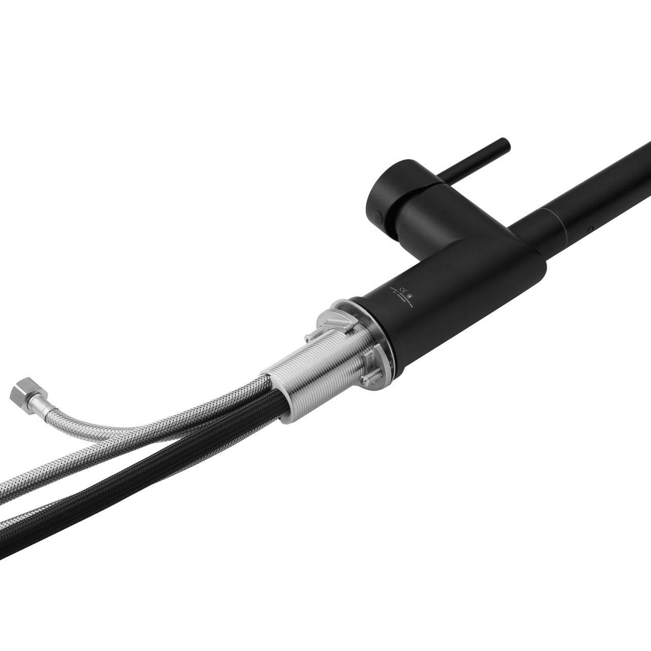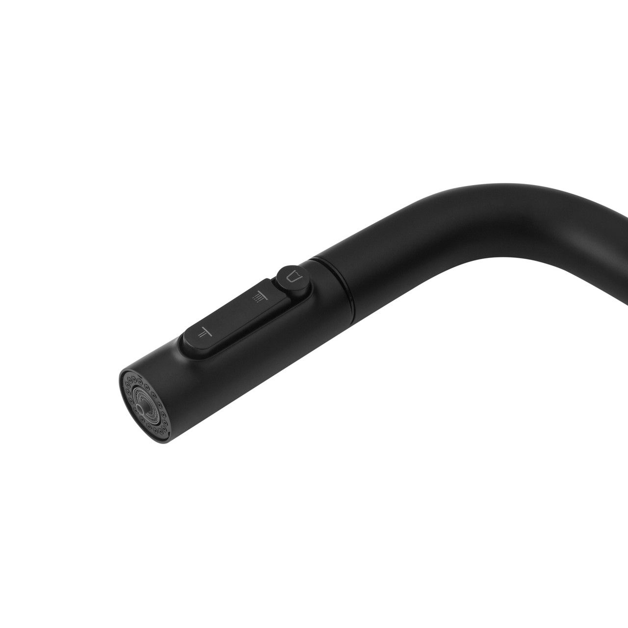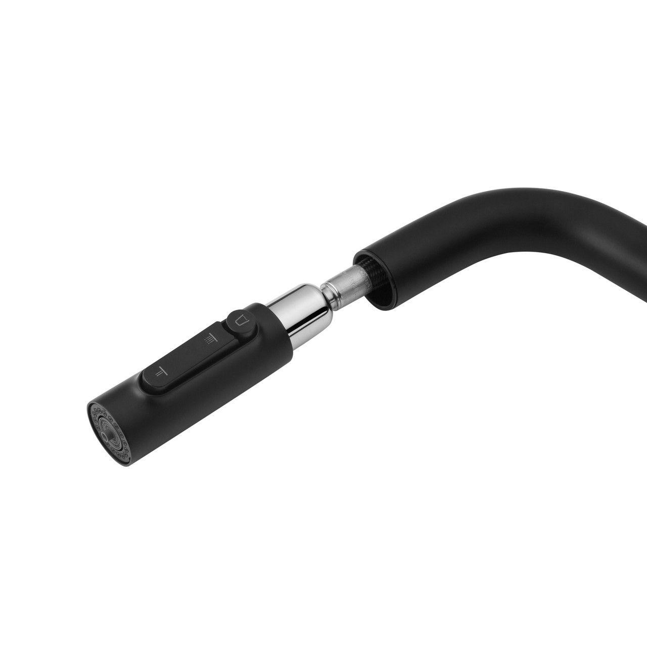 Модель оснащена выдвижным шлангом, что значительно упрощает мытьё посуды, наполнение ёмкостей и уход за мойкой. Особенностью смесителя является удобное управление подачей питьевой воды — кнопка переключения расположена прямо на самой выдвижной лейке, что делает использование максимально интуитивным и комфортным без лишних движений.