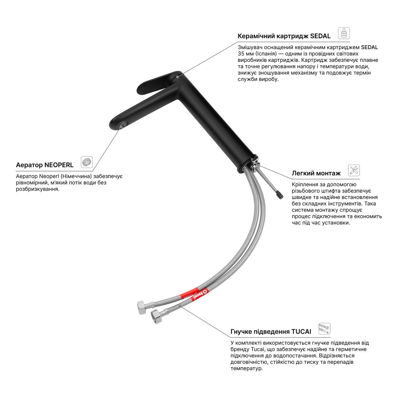 Додаткові характеристикиКорпус з латуні Н59. Картридж SEDAL - Іспанія. Аератор Neoperl - Німеччина. Гнучке підведення Tucai - Іспанія.