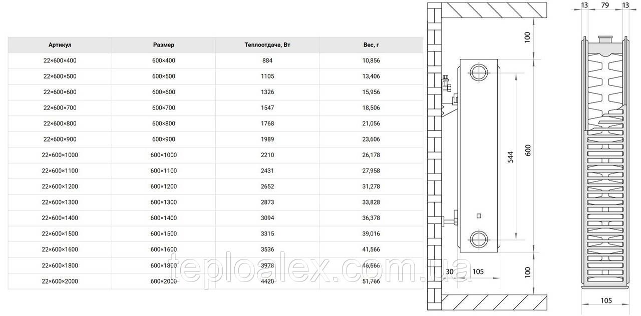 Стальной радиатор 600x1300 22тип боковое подключение панельный EUROPRODUCT батарея панельная стальна
