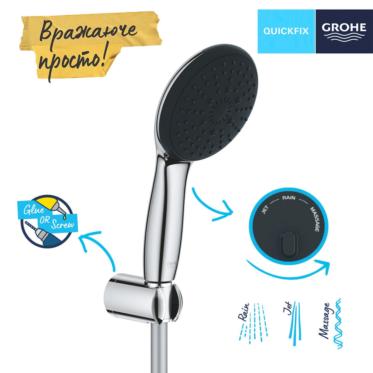 Душевой набор Grohe QuickFix Vitalio Start 110 – это идеальное решение для комфортного и безопасного принятия душа. Набор состоит из ручного душа Vitalio Start 110 (26 031), настенного держателя ручного душа Vitalio Universal (27 958), который не регулируется, и душевого шланга VitalioFlex Trend длиной 1750 мм (1/2" x 1/2").