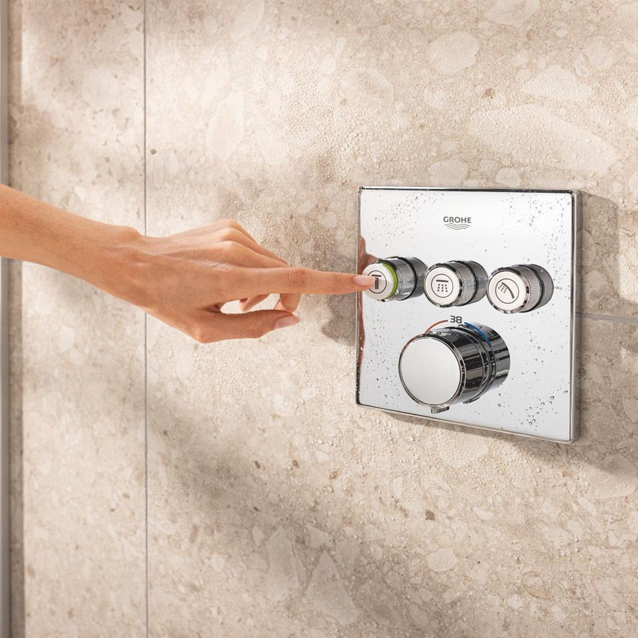 Термостат Grohe Precision SmartControl, предназначенный для скрытого монтажа с использованием универсальной коробки Rapido SmartBox, имеет современный кубический дизайн и обеспечивает превосходную функциональность благодаря немецкой инженерии. Технология Grohe TurboStat поддерживает постоянную температуру воды, а технология Grohe Water Saving снижает расход воды и энергии без ущерба для комфорта. Инновационная технология Grohe SmartControl позволяет легко управлять душем: просто выберите нужный режим распыления и отрегулируйте объем воды от экономичного потока до полного напора одним нажатием и поворотом кнопки.