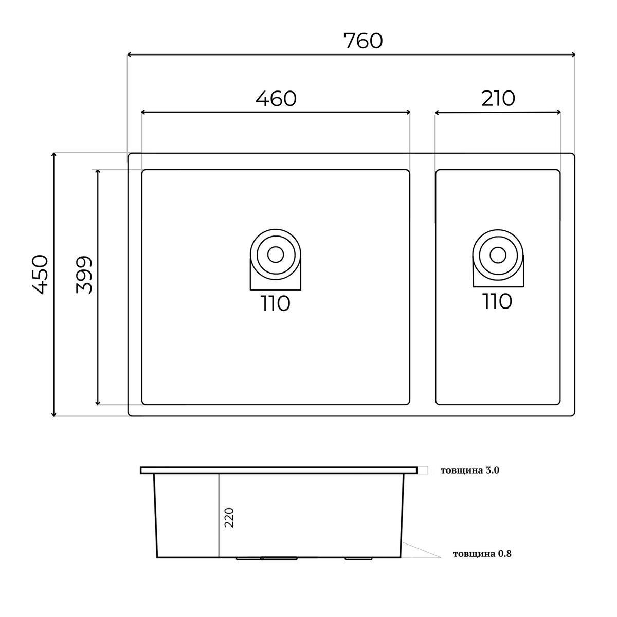 76*45 Мийка PVD чорна монтаж під стільницю Valeso Handmade (3.0/0.8)
