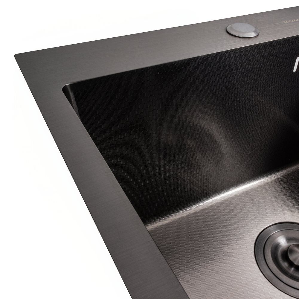 Кухонная мойка VALESO Handmade: Выполнена из прочной нержавеющей стали SUS 201 со специальным защитным покрытием PVD DECOR. Такое покрытие эффективно защищает поверхность от царапин, потемнения и известкового налета. Благодаря толщине стали 3.0 мм на верхней панели и 0.8 мм в чаше, мойка отличается повышенной надежностью и устойчивостью к температурным перепадам.