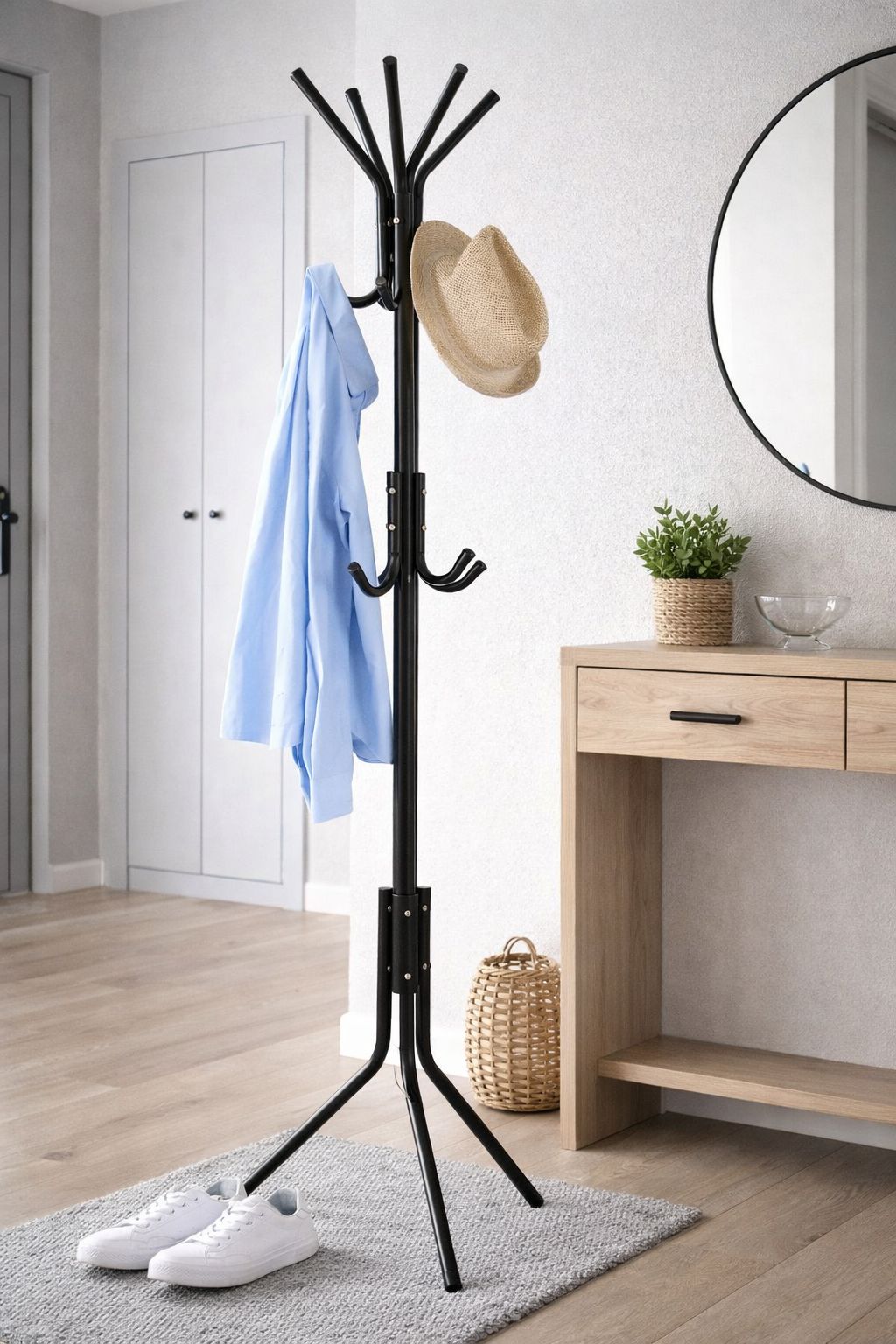 Вешалка оборудована с несколькими крючками на разных уровнях, что позволяет удобно разместить верхнюю одежду, сумки, шарфы и шапки. Устойчивое металлическое основание с ножками обеспечивает хороший баланс даже при полной загрузке.