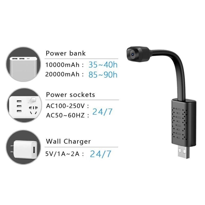 WiFi мини камера с гибким объективом имеет корпус выполненный из ABS пластика. Корпус не имеет влагозащиты, поэтому предназначен только для использования внутри помещения. Питание камеры от внешнего источника - адаптера питания, Power Bank, аккумулятора 5 Вольт. Никакой встроенной батареи данная камера не имеет, поэтому автономно работать не сможет.