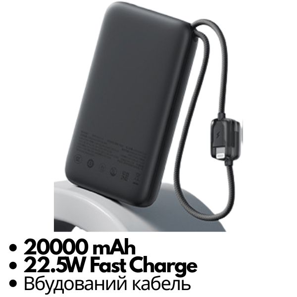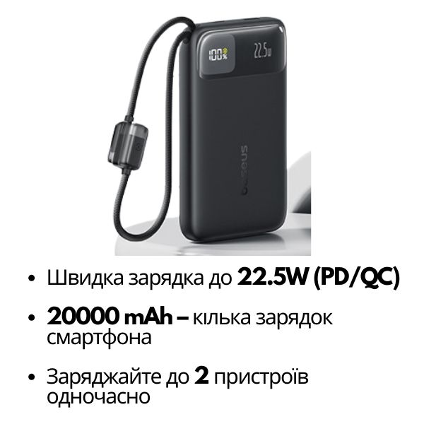 Power Bank Baseus 20000 мАч 22,5 Вт со встроенным кабелем, быстрая зарядка PD/QC Черный