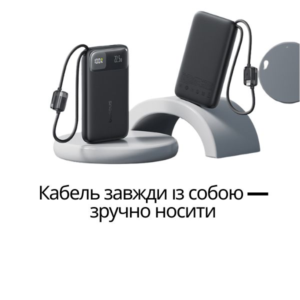 Power Bank оснащен встроенный кабель, который легко прячется в футляр и при этом выполняет роль ремень для переноски. Это удобно и практично – кабель всегда с собой.
