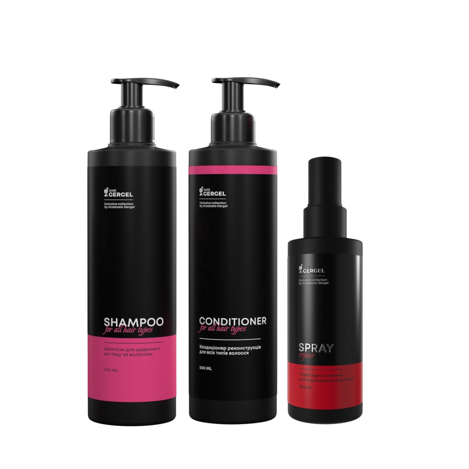 Набор состоит из шампуня, кондиционера и спрея.
