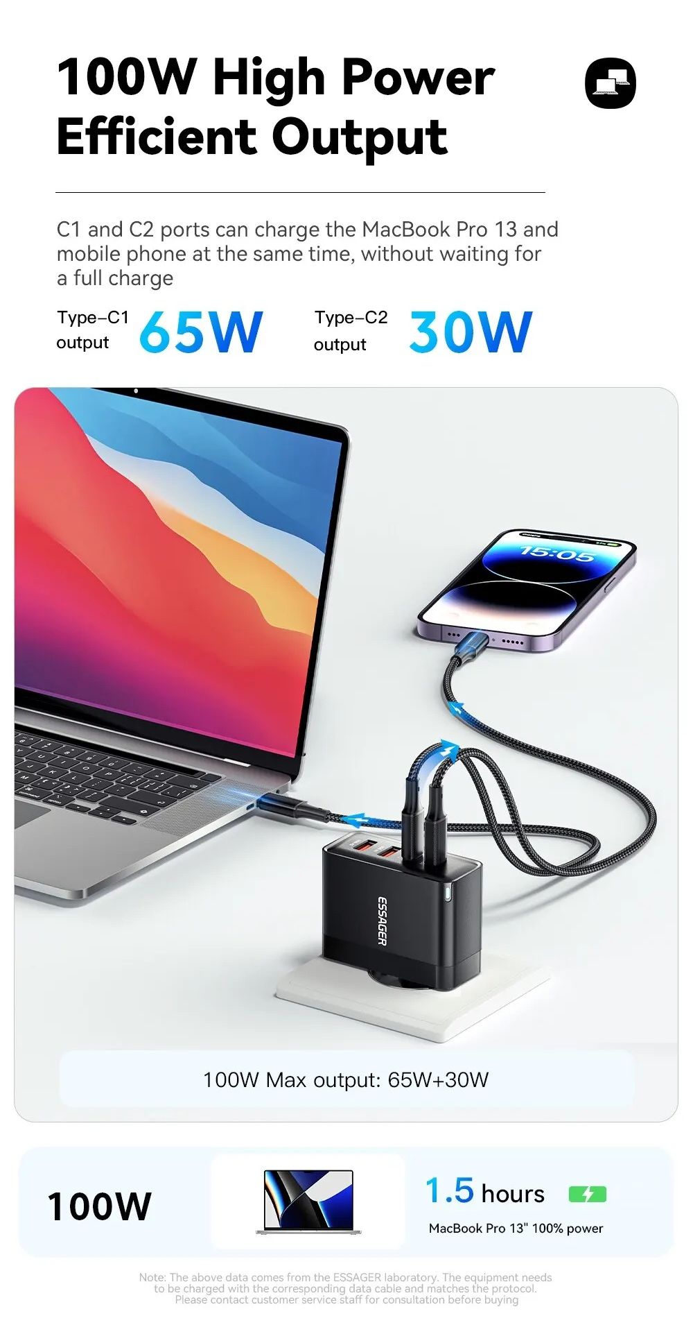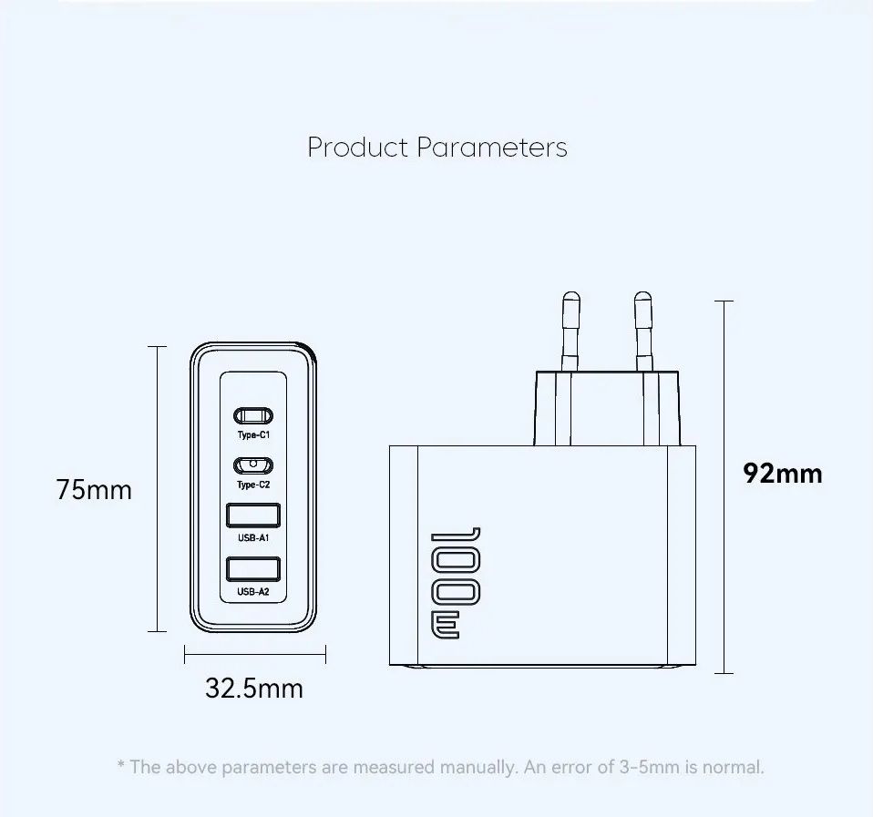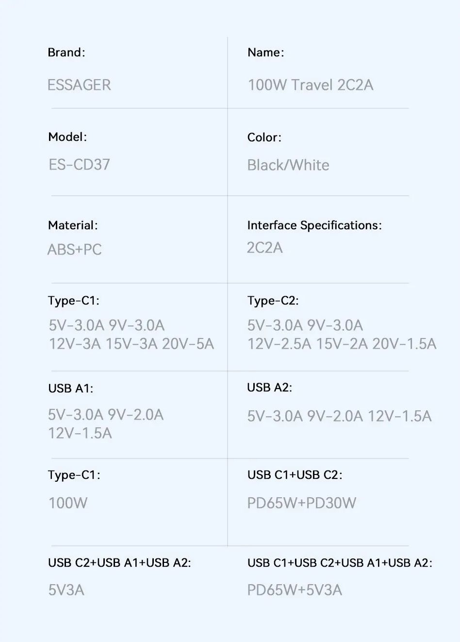 - Type-C1: 5V/3A; 9V/3A; 12V/3A; 15V/3A; 20V/5A (100W Max)