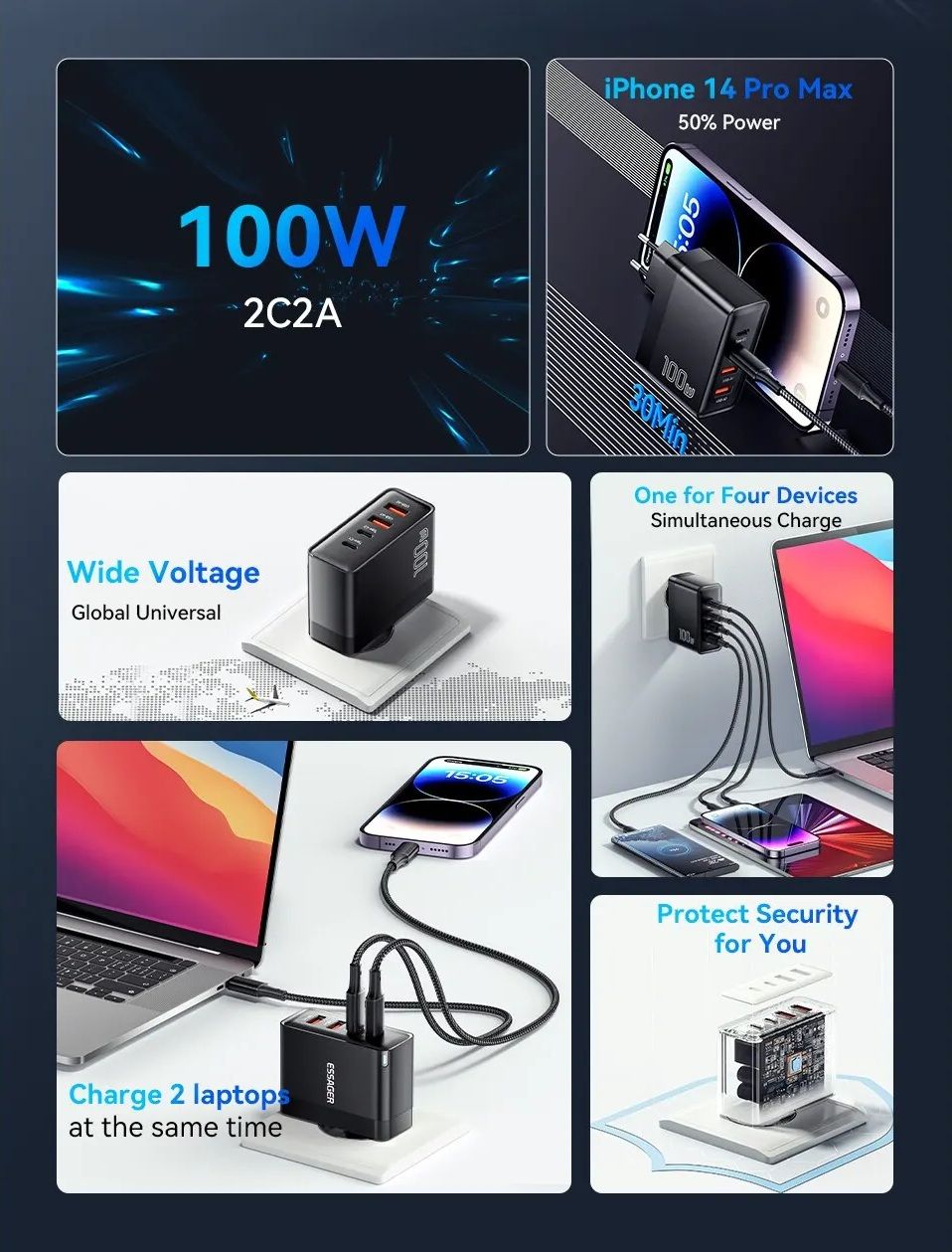 Зарядное устройство Essager 100W GaN QC 4.0 2xType-c 2xUSB Black