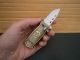 Лезвие ножа выкидывает и фиксируется с помощью кнопки. Зажигалка расположена в торце рукоятки.