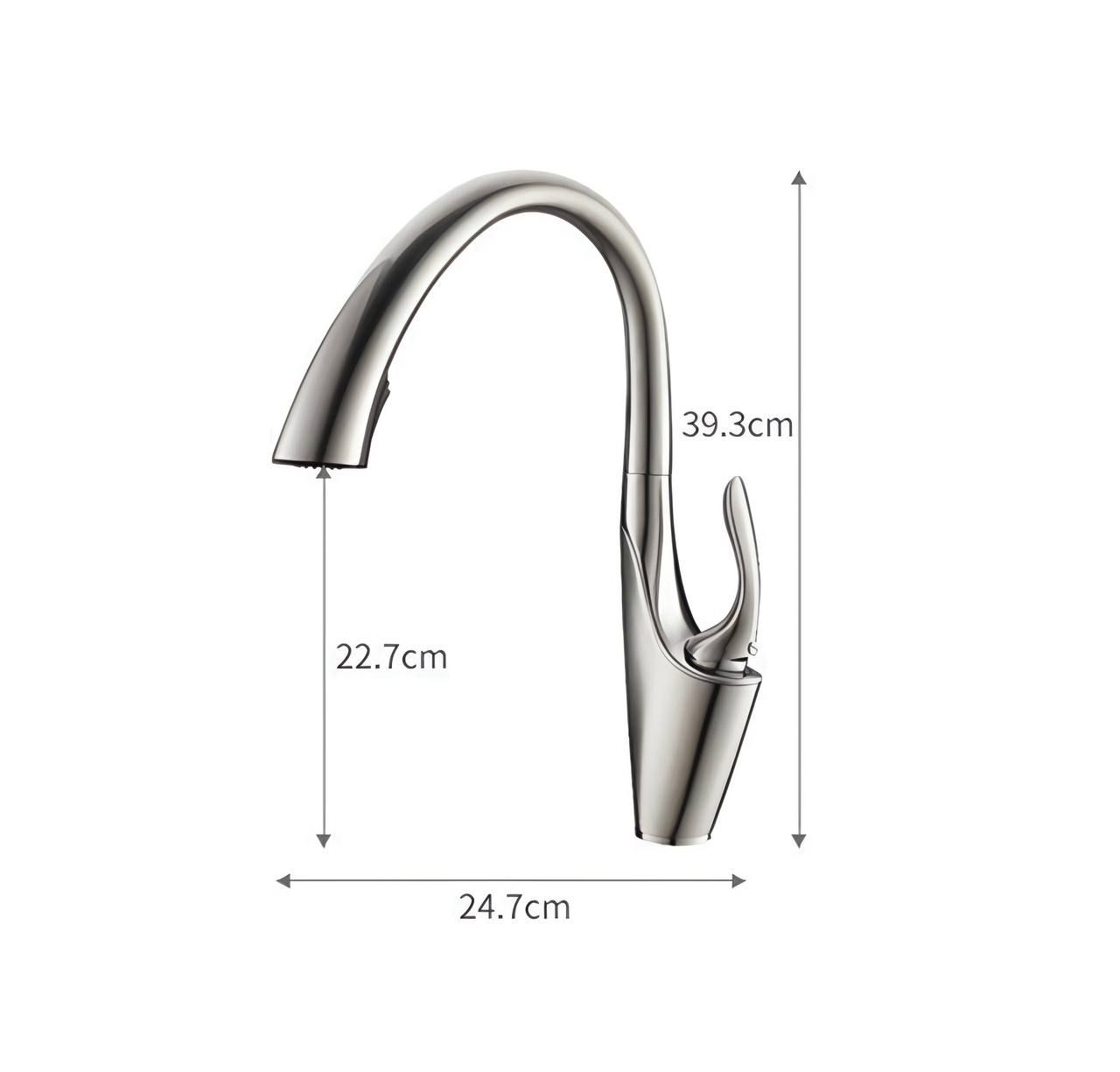 Габариты: Высота смесителя составляет 430 мм, высота от основания до носика — 247 мм, а длина излива — 227 мм.