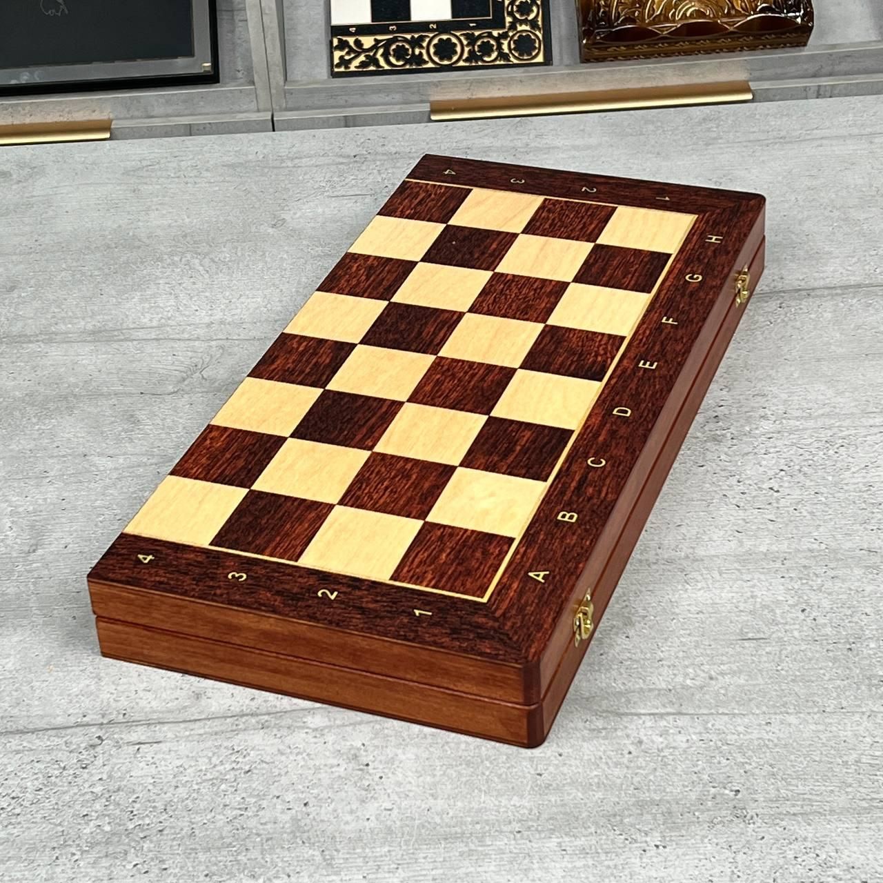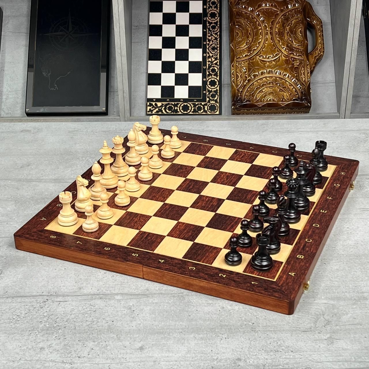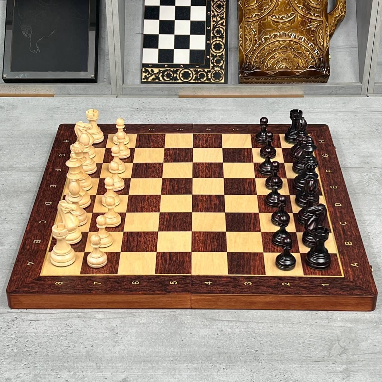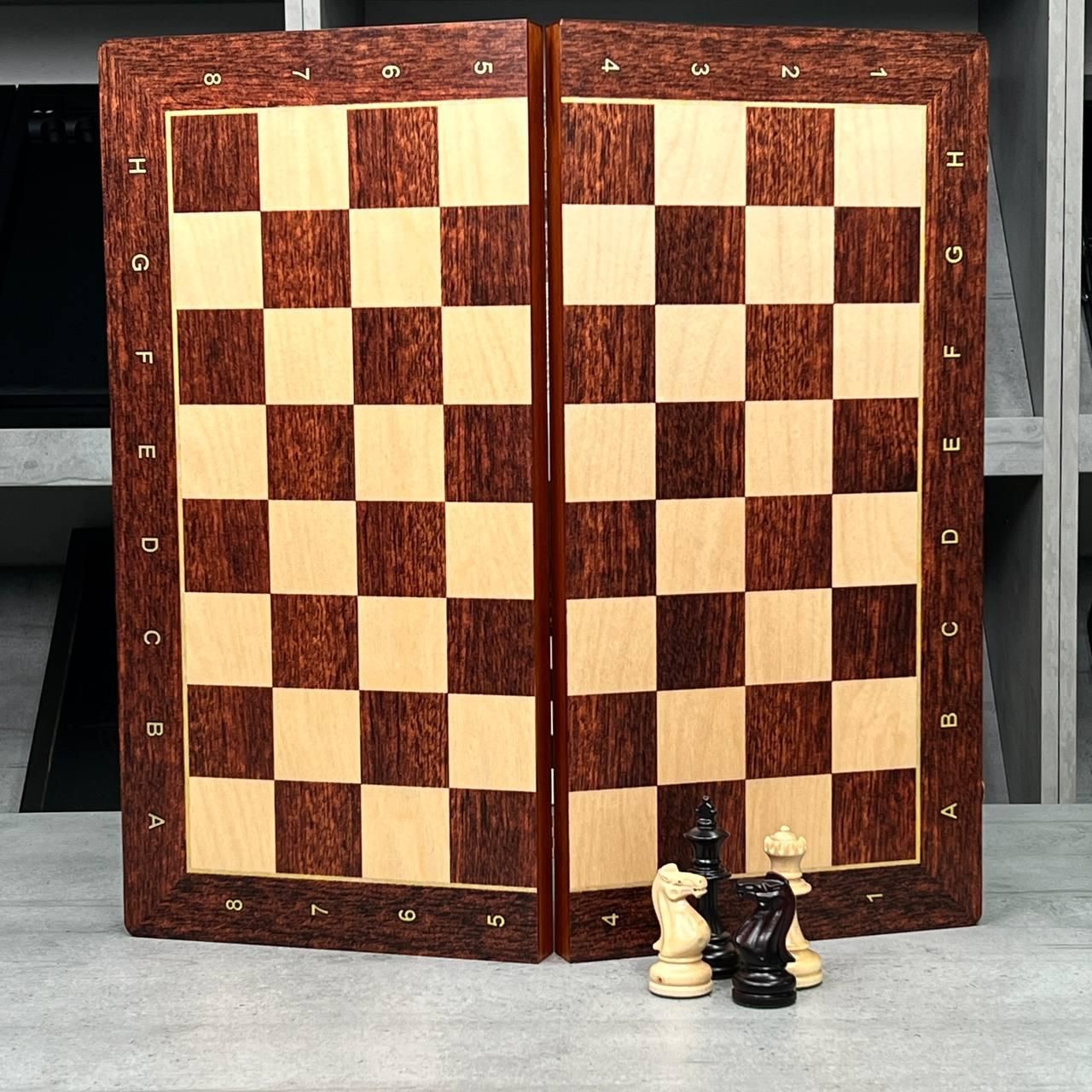Классический шахматный набор премиумкласса – складная доска 53х53 см и тяжелые фигуры Ищете сочетание профессионального стандарта и эстетики натурального дерева? Этот набор создан для настоящих любителей игры. Благодаря размеру ячейки 5,5х5,5 см, набор полностью отвечает требованиям для турнирных и домашних партий. Почему этот набор стоит вашего внимания: Материалы и покрытия: Доска и фигуры изготовлены из отборной древесины и покрыты профессиональным итальянским двухкомпонентным полуматовым лаком. Он защищает изделие от влаги и царапин, при этом не создает бликов от ламп, что важно для концентрации во время игры. Сложная конструкция: Размер доски в развернутом виде – 53х53 см, в сложенном – 53х26х6 см. Это позволяет удобно сохранять фигуры внутри доски, защищая их от пыли и повреждений. Тяжелые профессиональные фигуры: Каждая фигура оснащена внутренним металлическим утяжелителем. Это придает им стойкость (фигуры не падают при случайных прикосновениях) и приятный вес. Эргономика: Великий король (10 см) и пропорциональная пешка обеспечивают отличную видимость позиции на поле. Технические характеристики: Размер доски: 53х53 см (в сложенном виде 53х26х6 см). Размер ячейки: 5,5х5,5 см. Параметры короля: высота 10 см, основание 4,2 см. Параметры пешки: высота 5 см, основание 3 см. Особенность: отягощенные фигуры, итальянский лак. Эти шахматы купить следует как для профессиональных тренировок, так и на подарок. Это статусный набор, который прослужит десятилетия. Остались вопросы? Звоните нам. Наши менеджеры всегда на связи и готовы ответить на все интересующие вас вопросы Адрес: Украина г. Стрый, ул. Заньковецкой, дом. 2, второй этаж