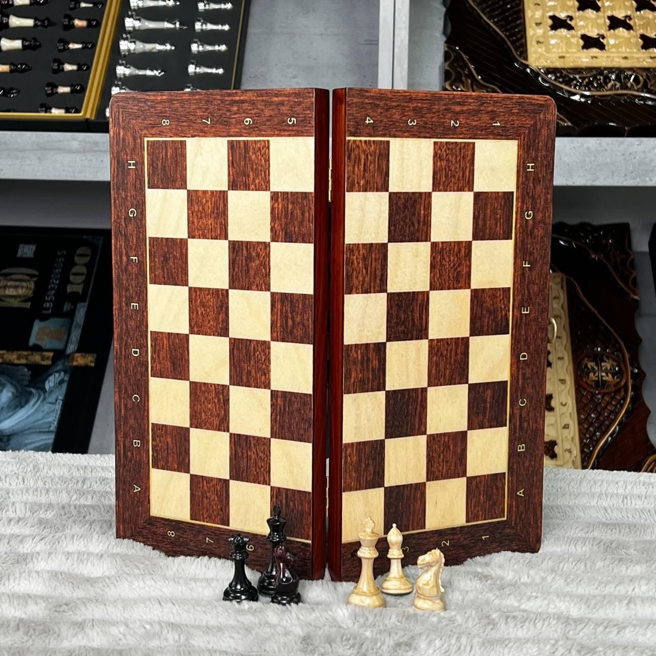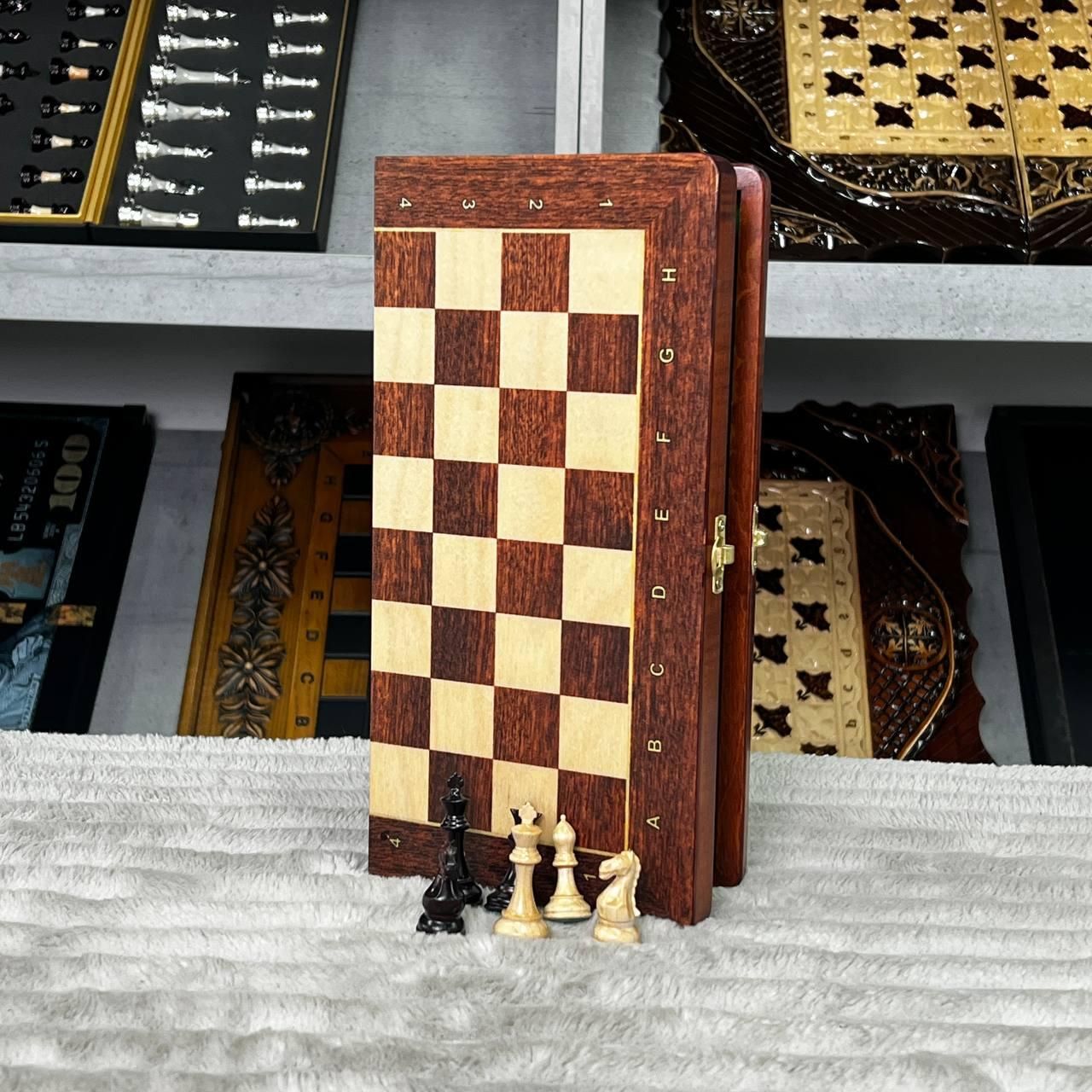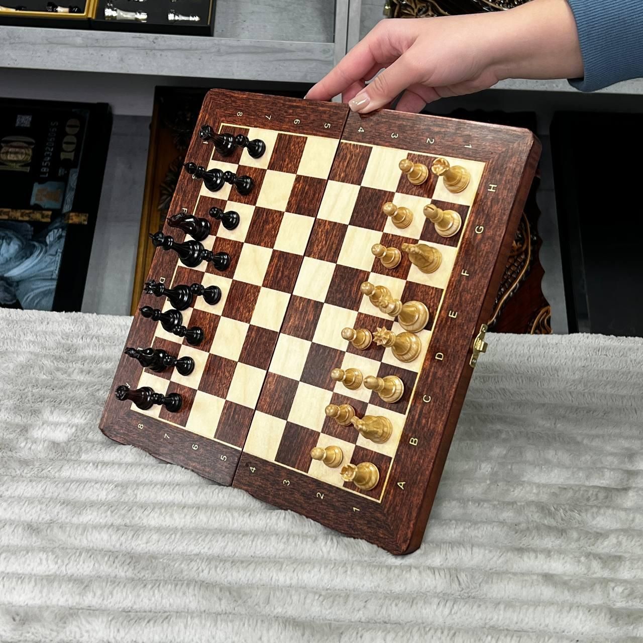 Шахматы деревянные магнитные 30×15 см • Портативные настольные шахматы с ложементом и фигурами из дерева Подробное описание Деревянные магнитные шахматы размером 30×15 см — это компактный и стильный набор для игры дома, в путешествии или в офисе. Благодаря встроенным магнитам фигуры надежно держатся на поле, что позволяет играть в дороге, не опасаясь их смещения. Шахматная доска изготовлена из натурального дерева, имеет аккуратную текстуру и классический дизайн. Внутри – удобный ложемент для каждой фигуры, гарантирующий порядок и сохранение набора. Деревянные фигуры оснащены магнитами: король имеет основу 2,2 см и высоту 5,5 см, пешку – основу 1,5 см и высоту 2,2 см. Это идеальный подарок для детей и взрослых, начинающих и любителей классических настольных игр. Особенности шахмат Магнитные фигуры – удобная игра в дороге или на нестабильной поверхности. Натуральное дерево: экологично, долговечно, приятно на ощупь. Ложемент внутри – каждая фигура имеет свое место. Компактный формат 30х15 см, удобно брать с собой. Надежные магнитики, удерживающие фигуры даже при тряске. Качественный ручной монтаж и аккуратная резьба. Подходят в качестве подарка для детей, взрослых, коллег, друзей. Оптимальное соотношение цена/качество. Характеристики товара Тип игры: шахматы Материал доски: дерево Материал фигур: дерево с магнитами Размер в сложенном виде: 30×15 см Размер в разложенном виде: 30×30 см Фигуры: деревянные, магнитные Король: основа 2,2 см, высота 5,5 см Пешик: основа 1 для фигур Назначение: домашняя игра, обучение, подарок, путешествия Заказывайте деревянные магнитные шахматы уже сегодня! Получите качественный, стильный и удобный набор, который станет отличным подарком и принесет часы увлекательной игры. Выбирайте качество, комфорт и классику, никогда не выходящую из моды. Остались вопросы? Звоните нам. Наши менеджеры всегда на связи и готовы ответить на все интересующие вас вопросы Адрес: Украина г. Стрый, ул. Заньковецкой, дом. 2, второй этаж
