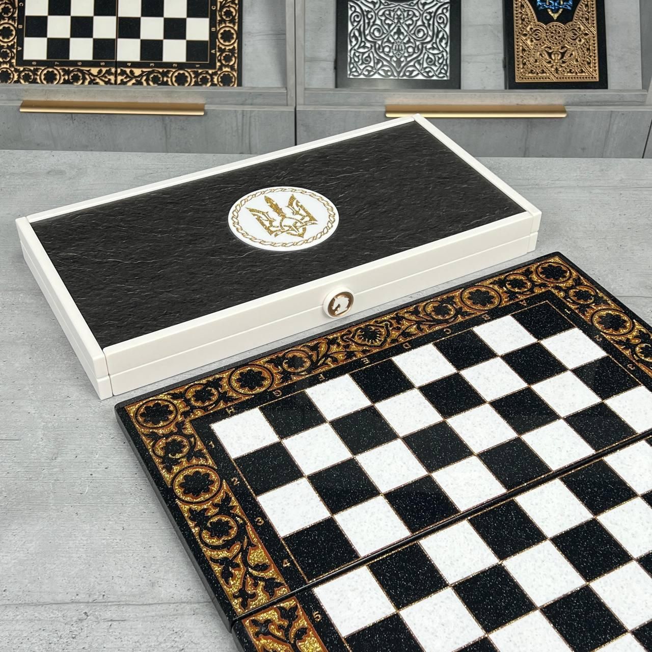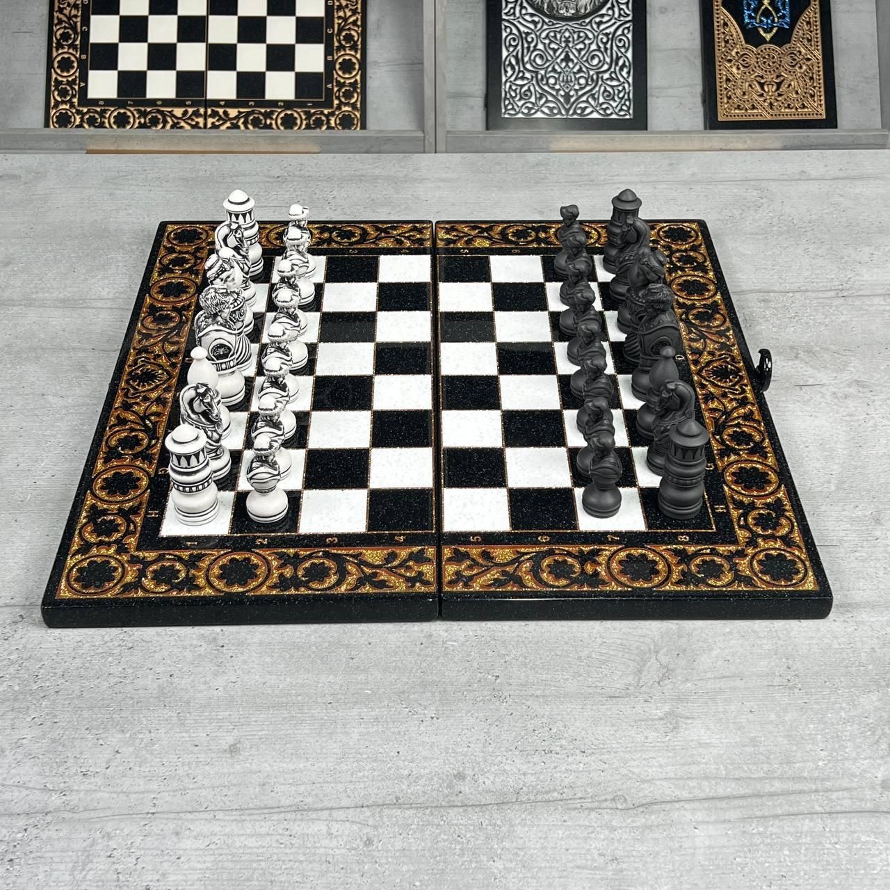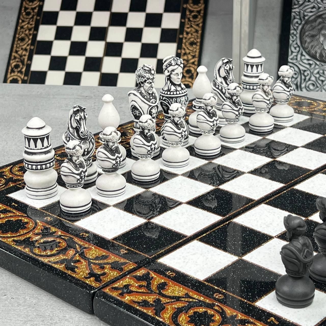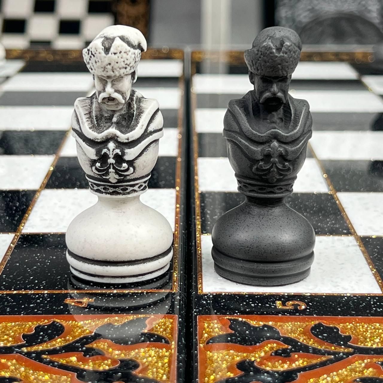 ♟ Шахматы из акрилового камня с персонализацией – эксклюзивный набор Описание товара Шахматы из – это роскошный набор, созданный для ценителей элитных настольных игр. Комплект состоит из шахматной доски размером 55х28х5 см и кейса с фигурами из акрилового камня (55х27х6 см). Уникальность изделия подчеркивают фигуры, стилизованные под казачье войско, которые можно персонализировать по индивидуальному дизайну. Игровое поле покрыто антикварной золотой краской и залито ювелирной смолой. Каждая ячейка имеет размер 5×5 см, что обеспечивает комфортную игру. Особенности и технические характеристики Этот набор сочетает в себе мастерство ручной работы и современные материалы. Акриловый камень обеспечивает крепкость, долговечность и эстетику. Фигуры отличаются детализацией: Король – высота 10,6 см, основание 3,5 см Пешик – высота 7 см, основание 3 см Шахматы можно персонализировать: нанести надпись, инициалы или создать фигуры в стиле, отражающем Вашу индивидуальность. Комплектация Шахматная доска из акрилового камня (1 шт.) Кейс с фигурами (1 шт.) Комплект фигур из акрилового камня (полный набор) ???? Заказы и консультации: +380732670070 Остались вопросы? Звоните нам. Наши менеджеры всегда на связи и готовы ответить на все интересующие вас вопросы Адрес: Украина г. Стрый, ул. Заньковецкой, дом. 2, второй этаж
