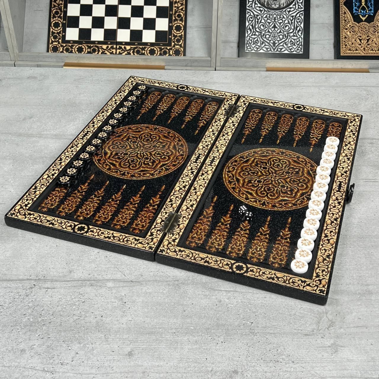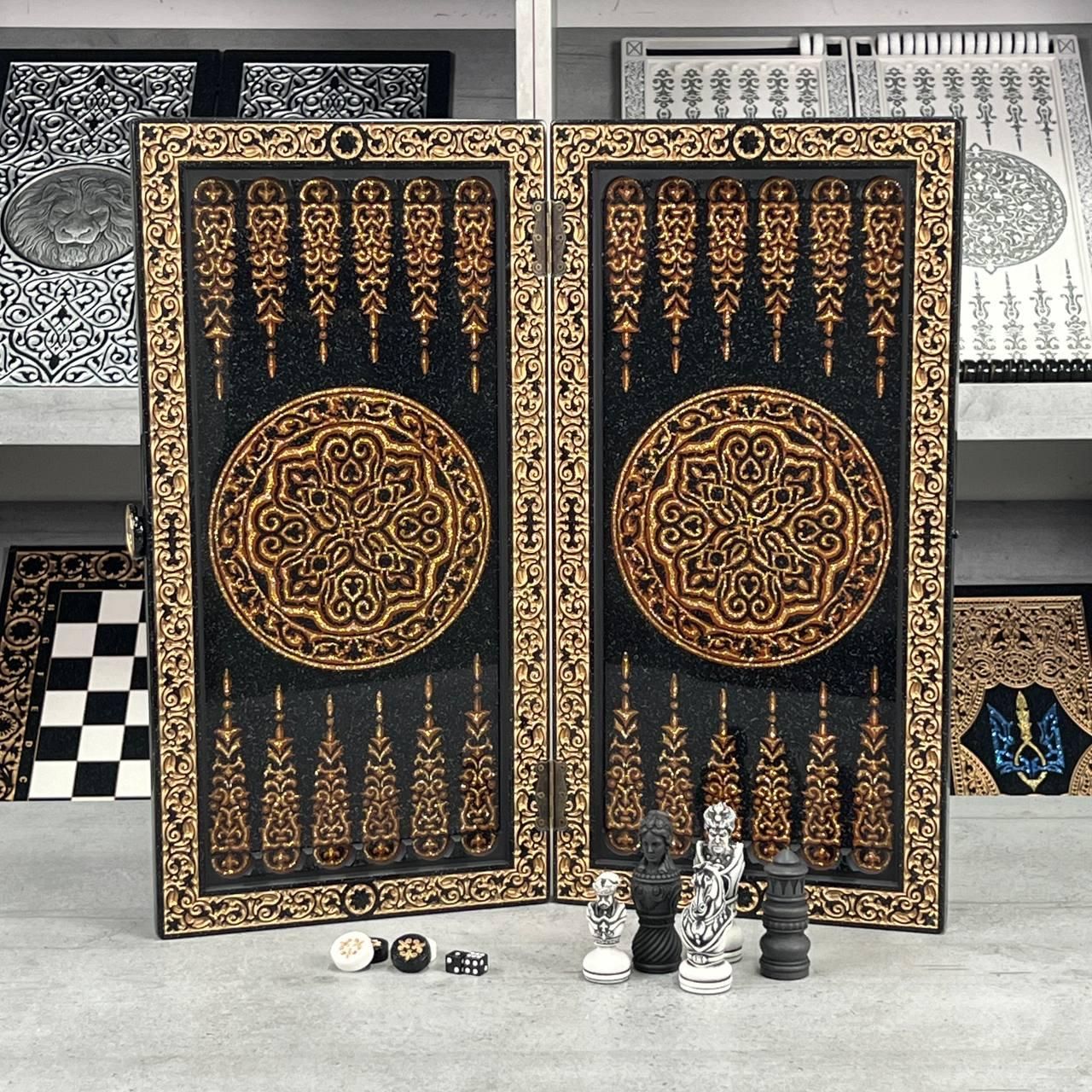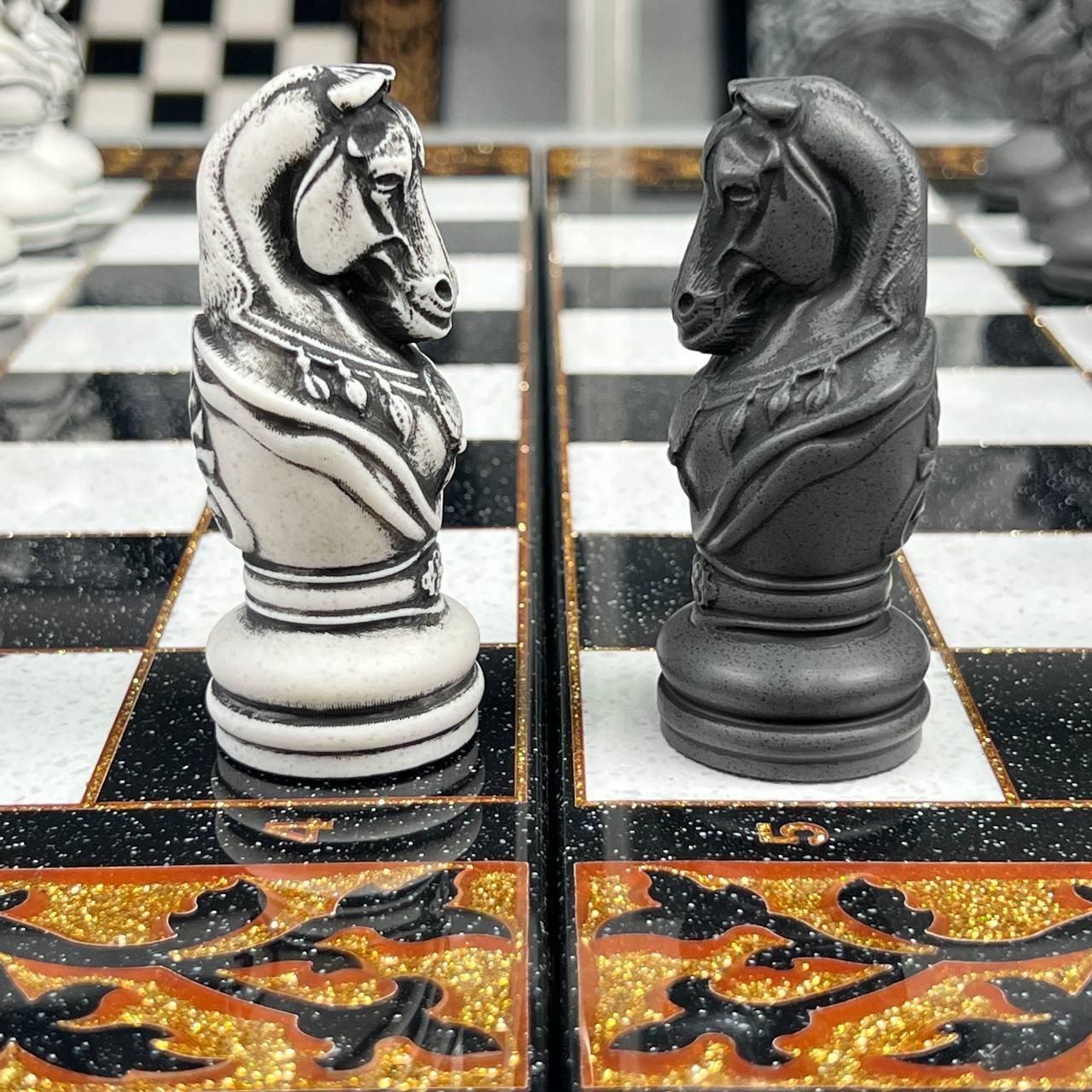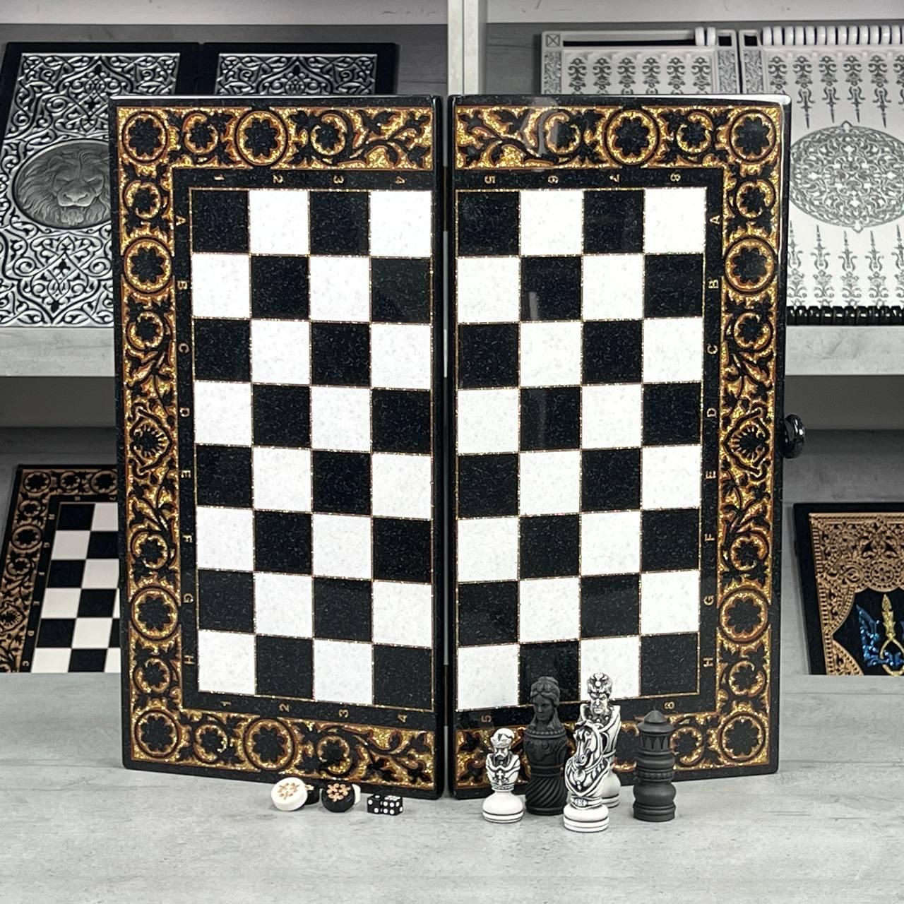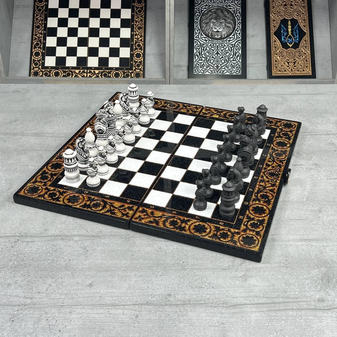 ♟ Шахматы из акрилового камня с персонализацией – эксклюзивный набор Описание товара Шахматы из – это роскошный набор, созданный для ценителей элитных настольных игр. Комплект состоит из шахматной доски размером 55х28х5 см и кейса с фигурами из акрилового камня (55х27х6 см). Уникальность изделия подчеркивают фигуры, стилизованные под казачье войско, которые можно персонализировать по индивидуальному дизайну. Игровое поле покрыто антикварной золотой краской и залито ювелирной смолой. Каждая ячейка имеет размер 5×5 см, что обеспечивает комфортную игру. Особенности и технические характеристики Этот набор сочетает в себе мастерство ручной работы и современные материалы. Акриловый камень обеспечивает крепкость, долговечность и эстетику. Фигуры отличаются детализацией: Король – высота 10,6 см, основание 3,5 см Пешик – высота 7 см, основание 3 см Шахматы можно персонализировать: нанести надпись, инициалы или создать фигуры в стиле, отражающем Вашу индивидуальность. Комплектация Шахматная доска из акрилового камня (1 шт.) Кейс с фигурами (1 шт.) Комплект фигур из акрилового камня (полный набор) ???? Заказы и консультации: +380732670070 Остались вопросы? Звоните нам. Наши менеджеры всегда на связи и готовы ответить на все интересующие вас вопросы Адрес: Украина г. Стрый, ул. Заньковецкой, дом. 2, второй этаж
