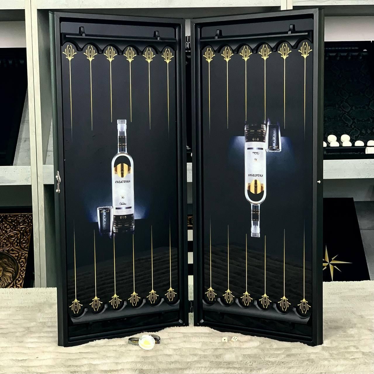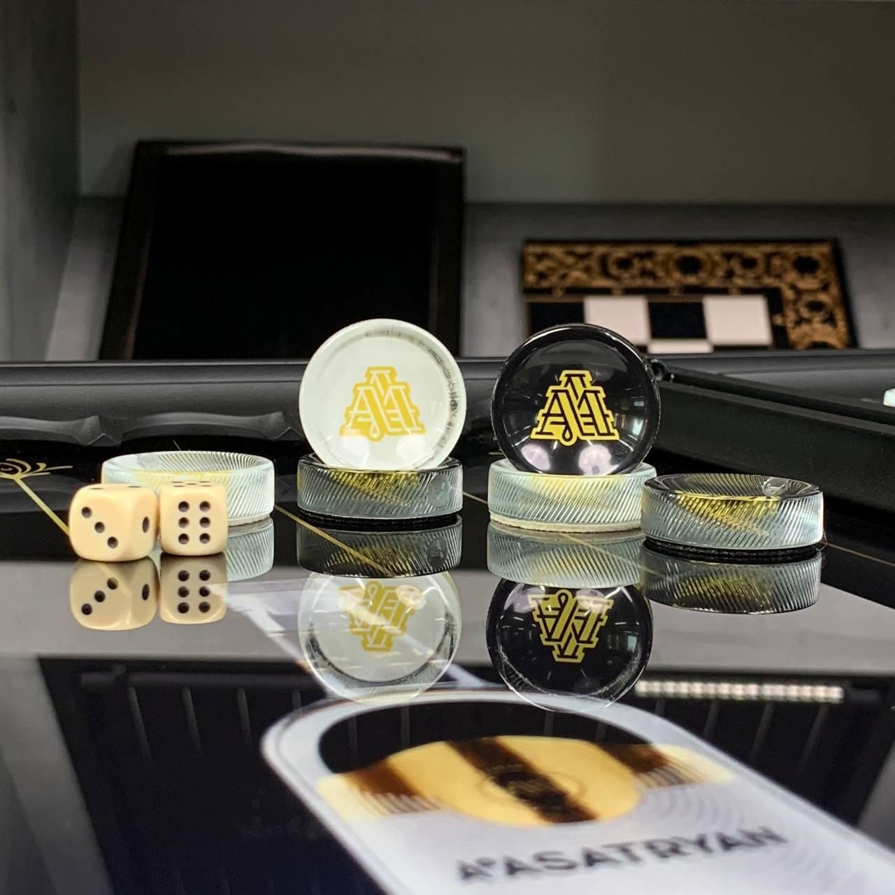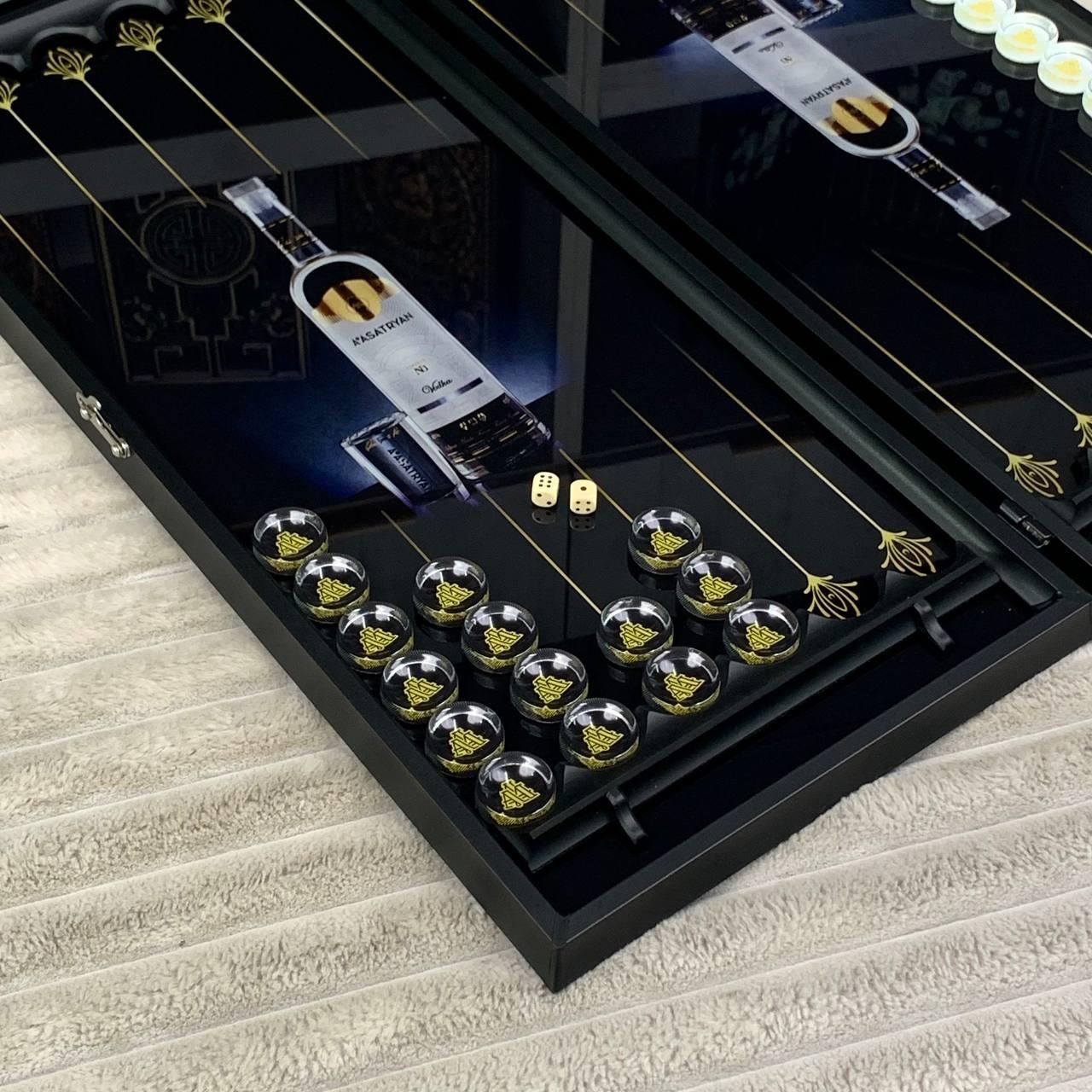 Стеклянные нарды в алюминиевом каркасе 61х27 см. Эксклюзивные нарды с УФ-печатью и фишками из эпоксидной смолы.