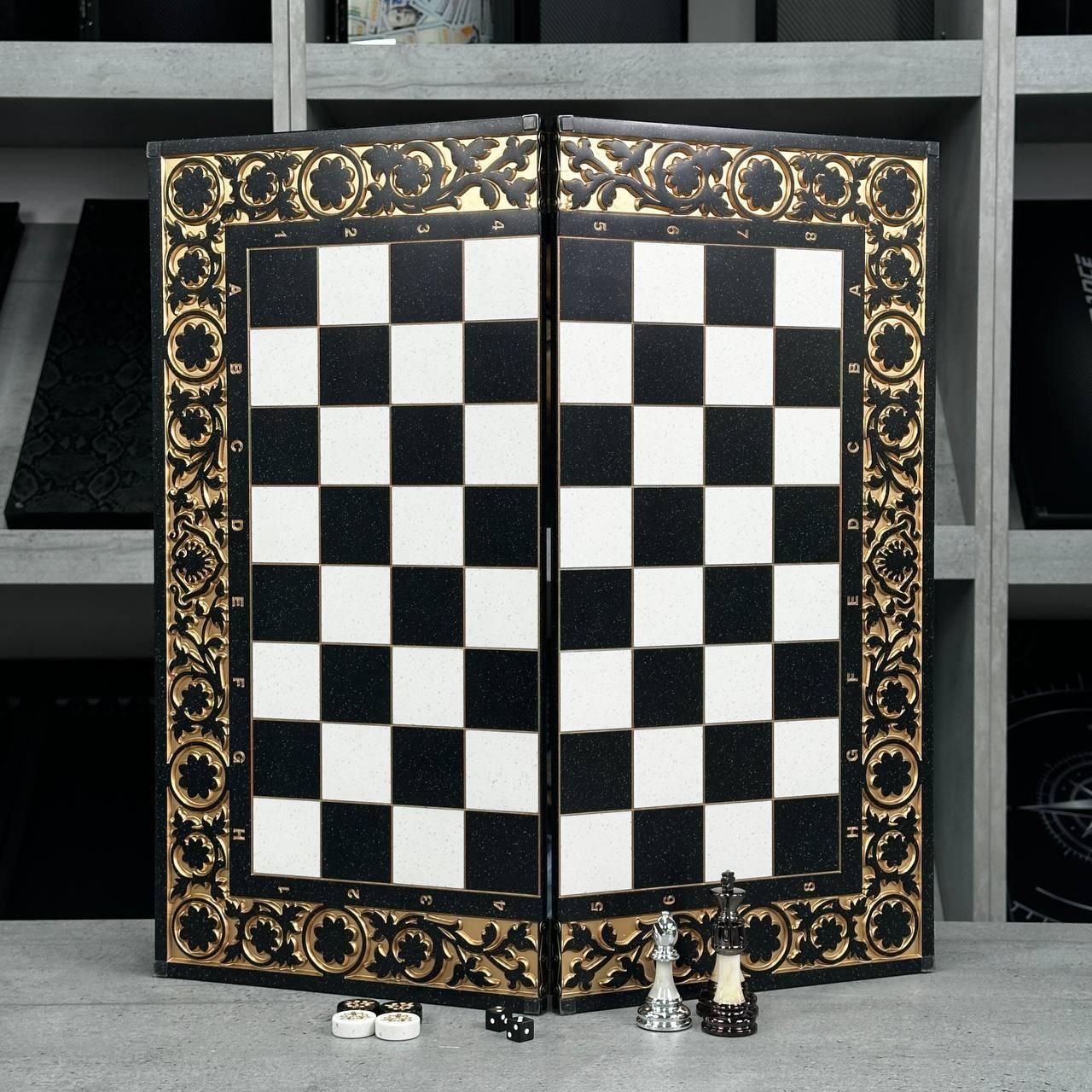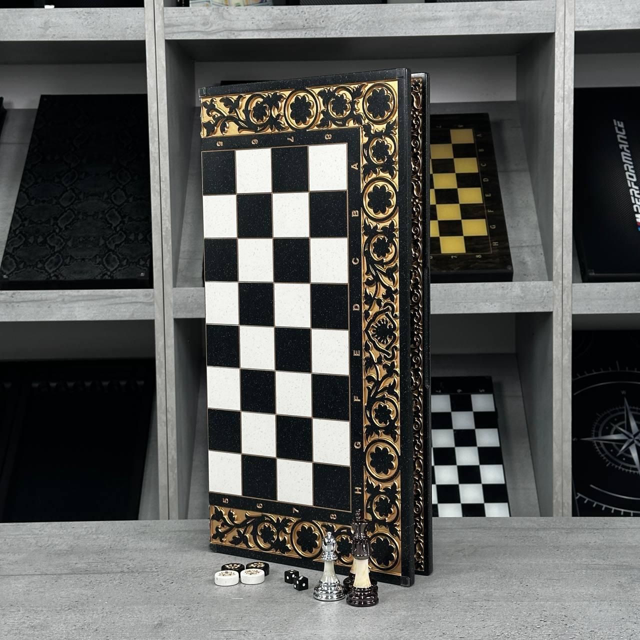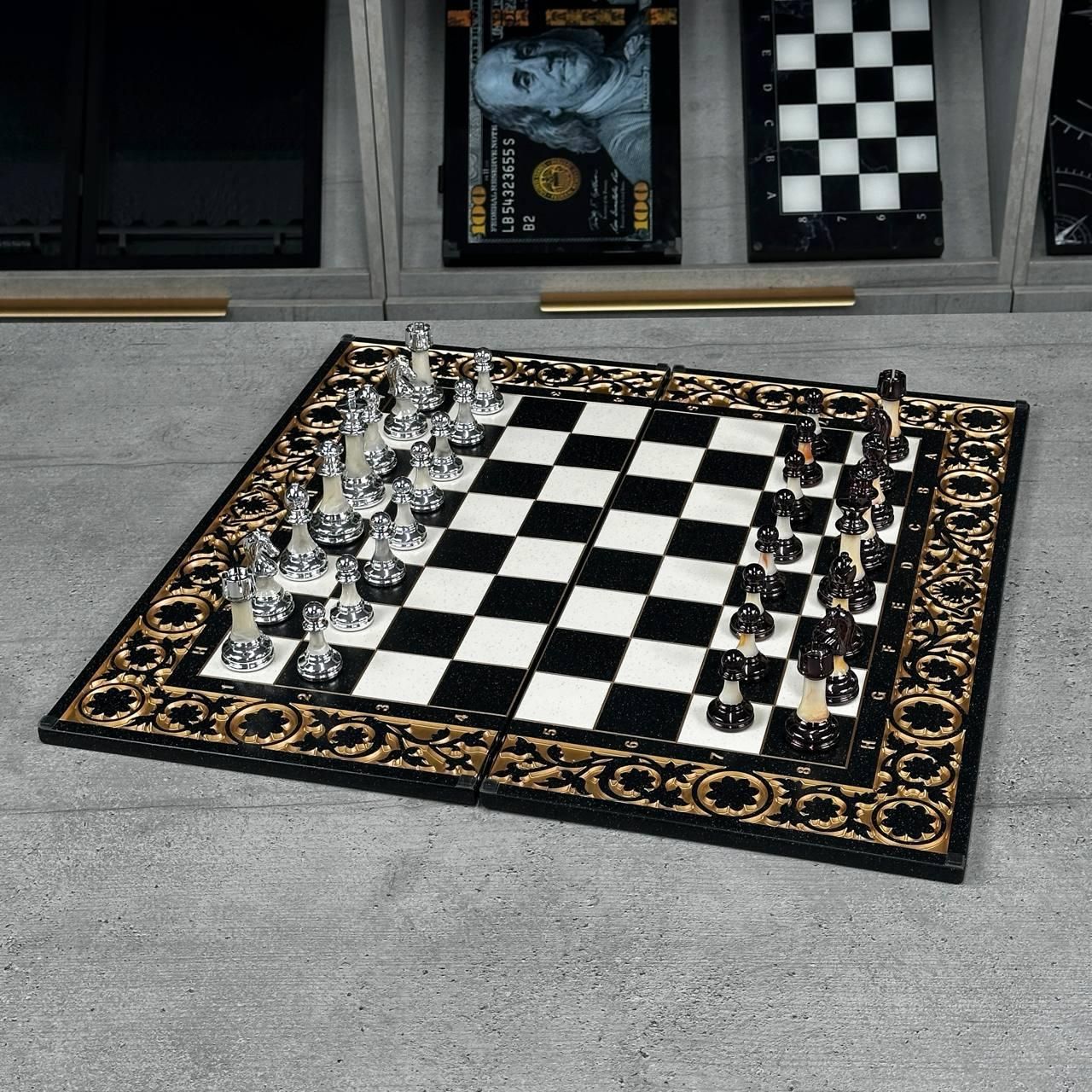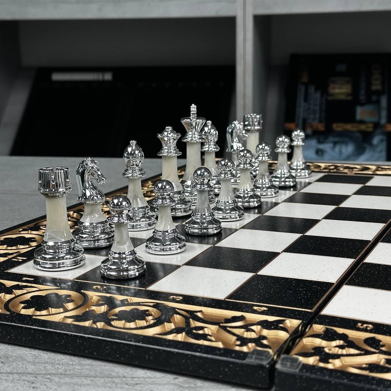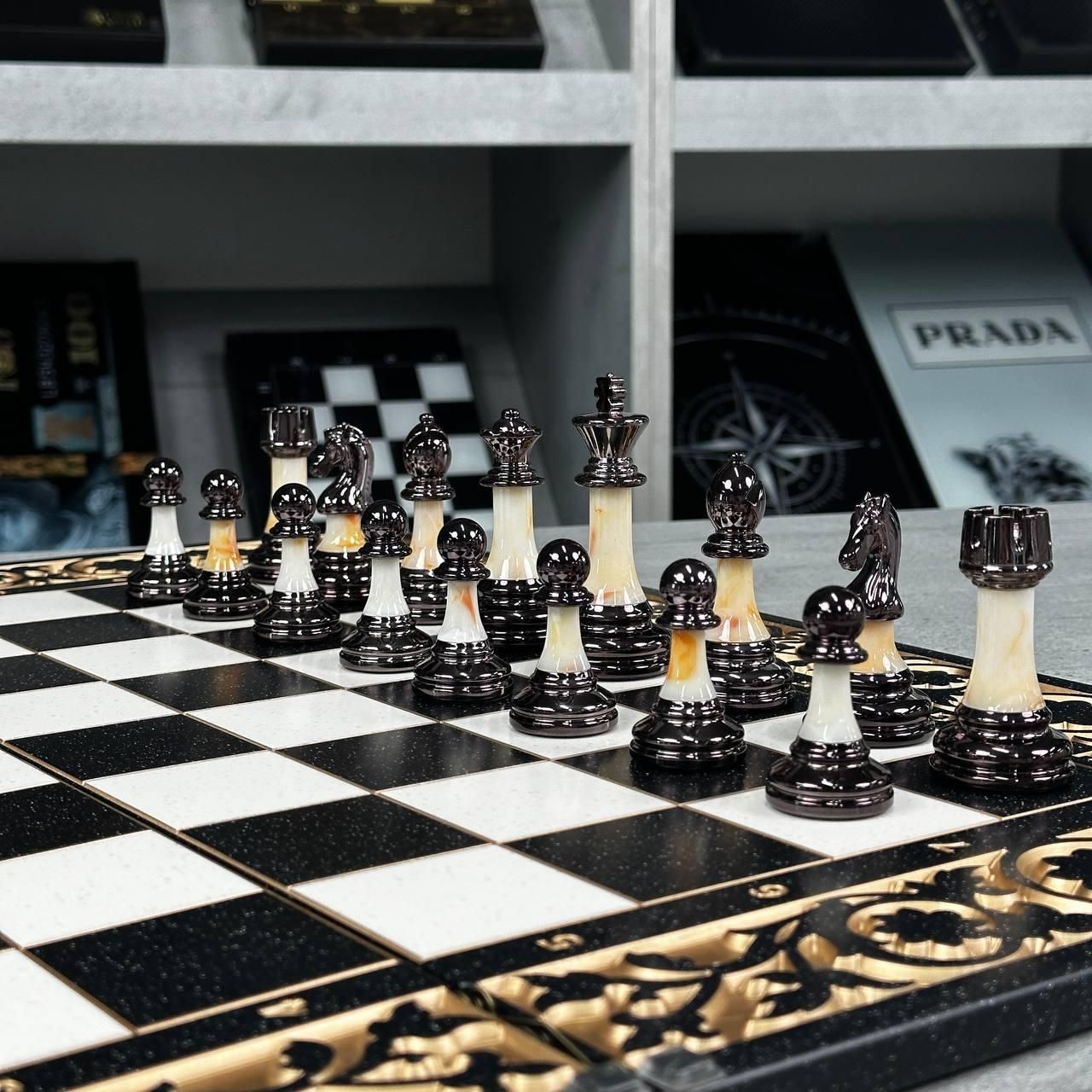 Шахматы, нарды из акрилового камня – набор 3 в 1 для настоящих ценителей Роскошный набор для настольных игр, сочетающий шахматы, шашки и нарды. Этот эксклюзивный комплект изготовлен из акрилового камня, имеет уникальный дизайн и станет идеальным подарком для любителей изысканных вещей. Игровое поле украшено ювелирной смолой, а золотое наполнение добавляет набор шарма и подчеркивает его аристократический стиль. Комплект шахматных фигур в сочетании с материалом премиум-класса производит идеальное впечатление. Эксклюзивный дизайн: шахматы, шашки и нарды в одном наборе. Материалы премиум класса: акриловый камень, ювелирная смола, антикварная краска. Практичность: удобный размер для игры – 58x28x2 см. Качественные фишки: диаметр 27 мм, выполненные из акрилового камня. Стилизованные шахматные фигуры: фигуры. Шахматный набор – это не просто настольная игра, это произведение искусства. Классические формы совмещены с современными материалами, создавая идеальный аксессуар для вашего интерьера или незабываемый подарок. Играя партию на таком наборе, вы подчеркиваете свой утонченный вкус и любовь к деталям. Технические характеристики Игра: шахматы, шашки, нарды (набор 3 в 1). Размеры: 58×28×2 см. Материал: акриловый камень, ювелирная смола. Цвет: черный, белый. Фишки: акриловый камень, диаметр 27 мм. Шахматные фигуры: фигуры ???? Закажите с персонализацией прямо сейчас! Создайте уникальный набор для вашей компании или близкого человека. Гравировка, фирменные цвета и логотип – все возможно! ???? Связь для индивидуального дизайна: Не останавливайтесь на достигнутом представлены и , которые смогут удовлетворить любые ваши вкусы и предпочтения. : Это классическая игра, которая на протяжении веков развлекает людей всех возрастов : Интеллектуальная игра, которая бросит вызов вашему уму Аксессуары для настольных игр: , , и многое другое, что сделает ваши игры еще более комфортными и приятными. Посетите наш и найдите ту игру, которая станет вашим новым любимым досугом! Остались вопросы? Звоните нам. Наши менеджеры всегда на связи и готовы ответить на все интересующие вас вопросы Адрес: Украина г. Стрый, ул. Заньковецкой, дом. 2, второй этаж