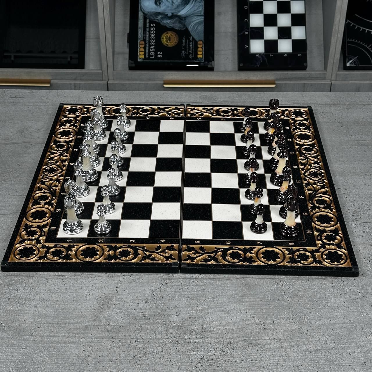 Шахматы из камня с текстурой черного мрамора 58×28×2см