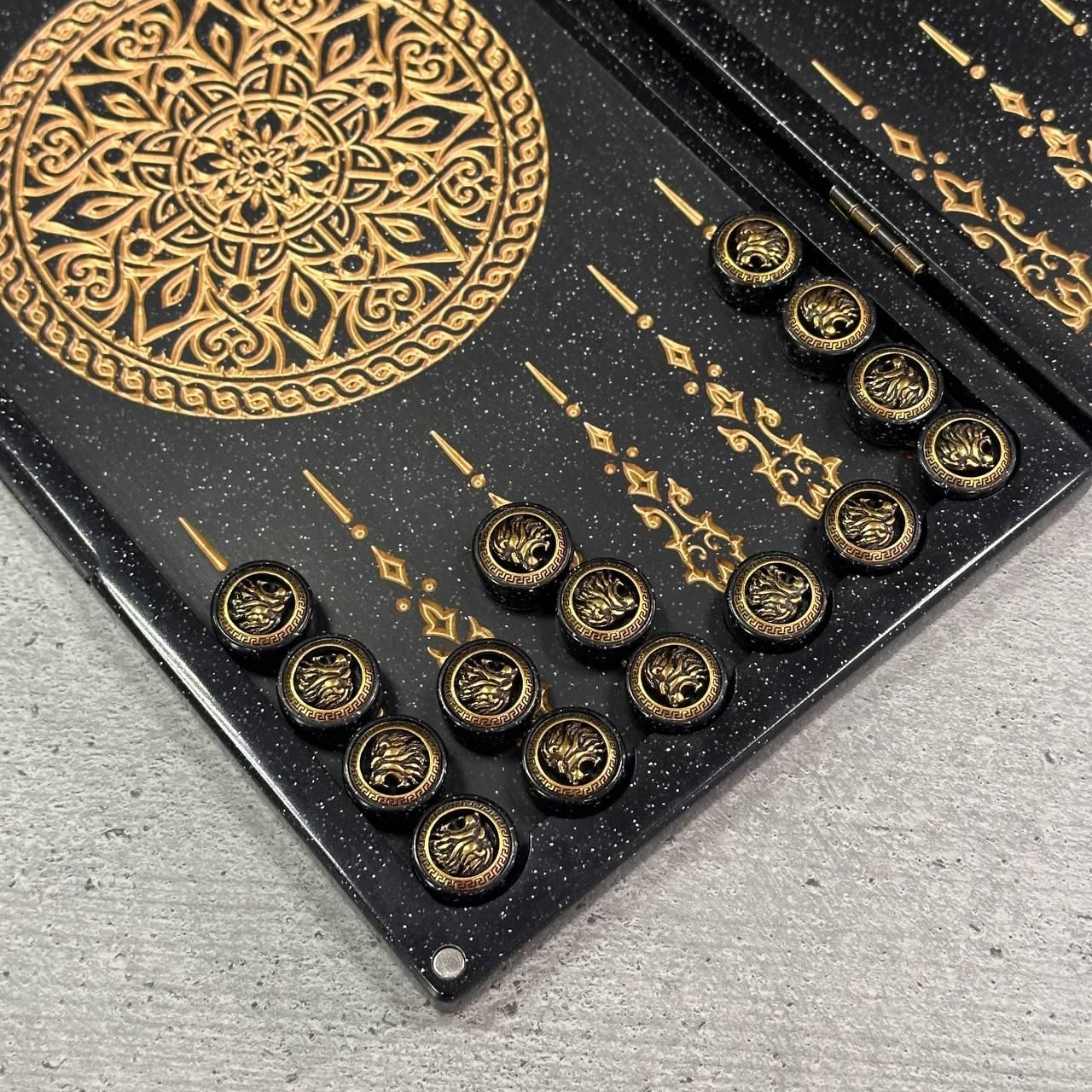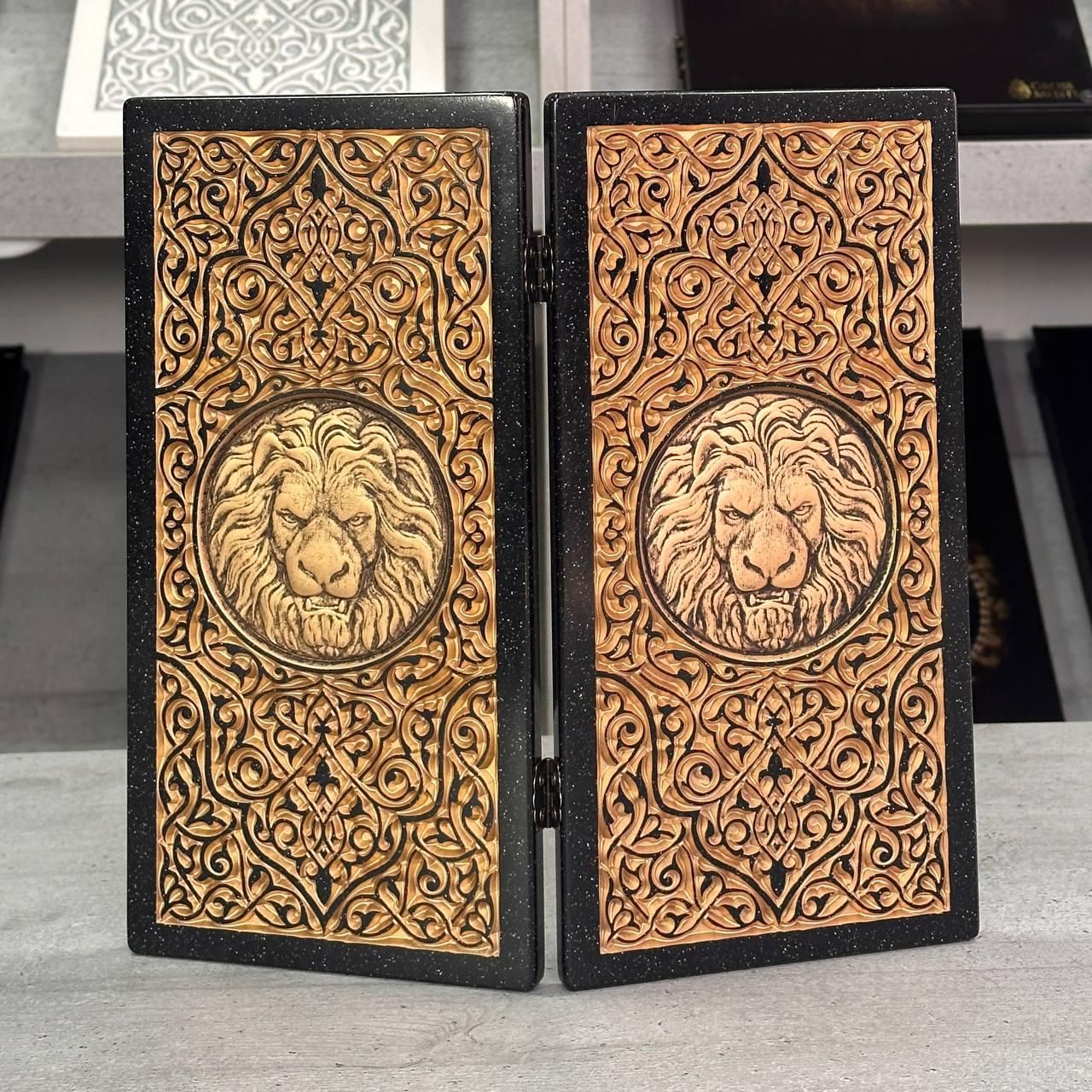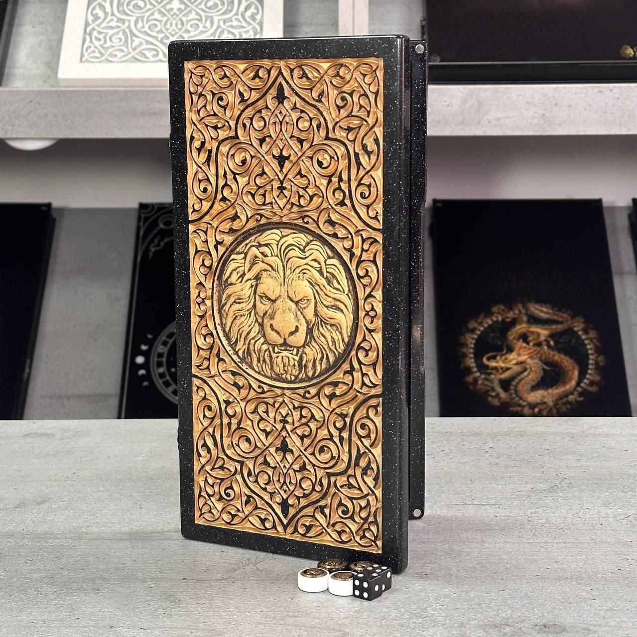 Нарды из черного камня с резьбой Лев премиальные 300 мм.