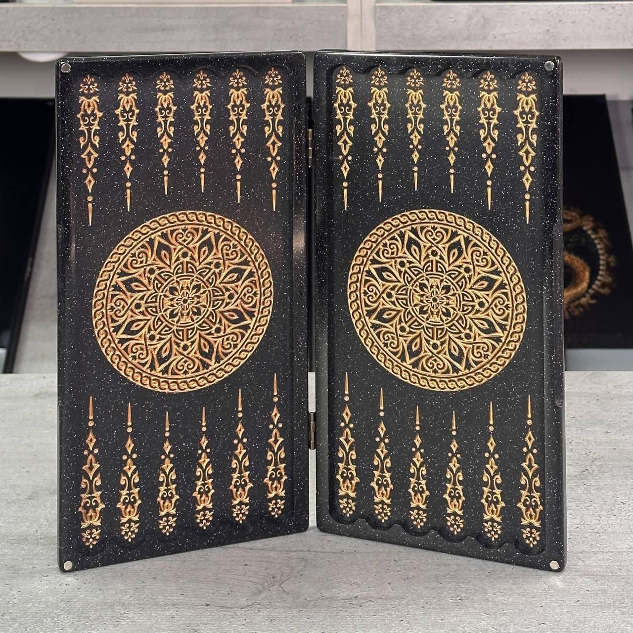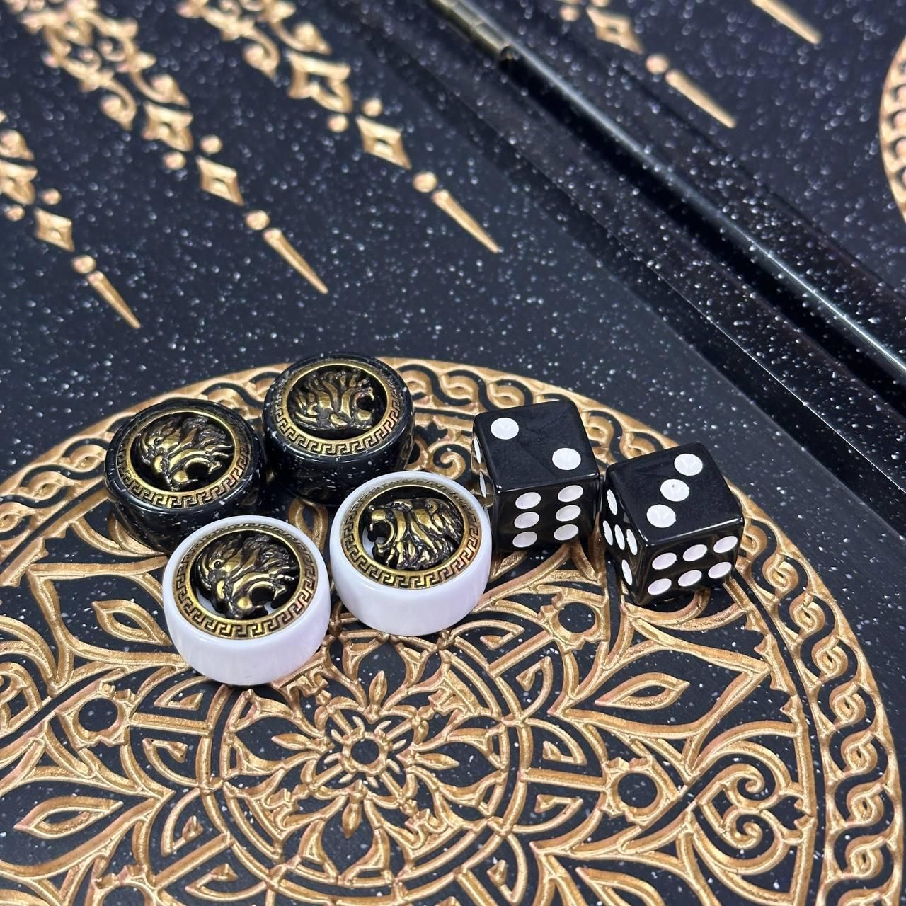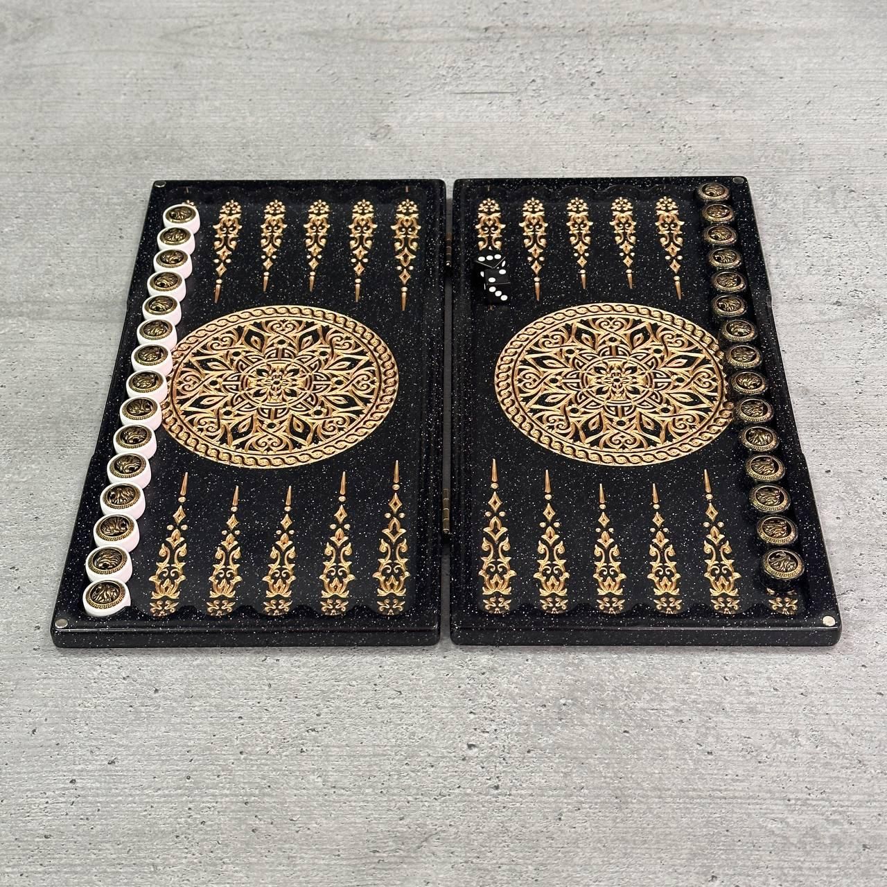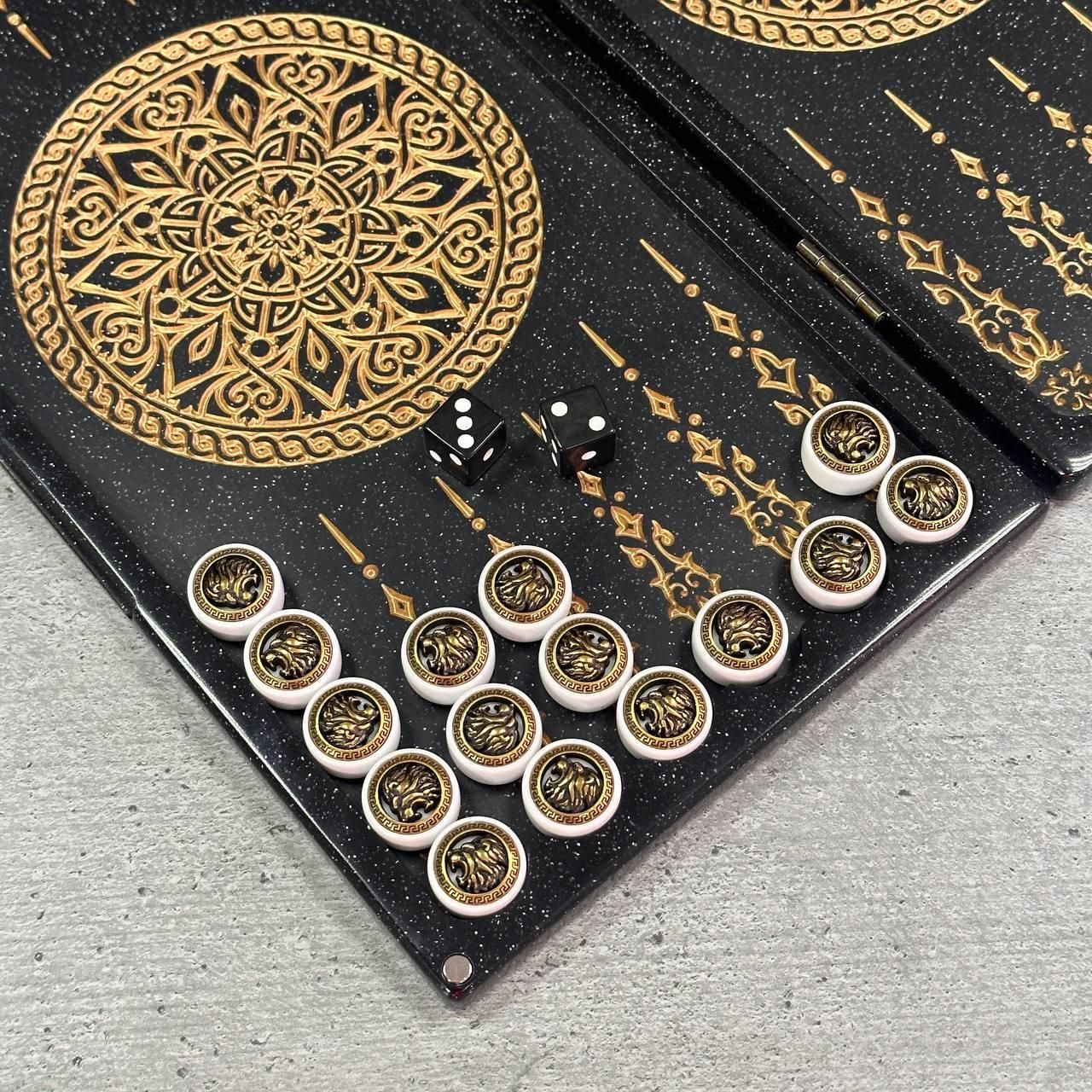 Нарды из черного камня с резьбой Лев премиальные 300 мм.