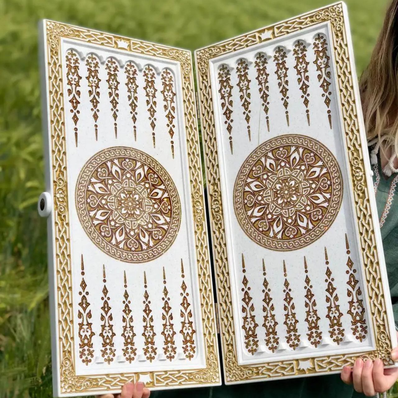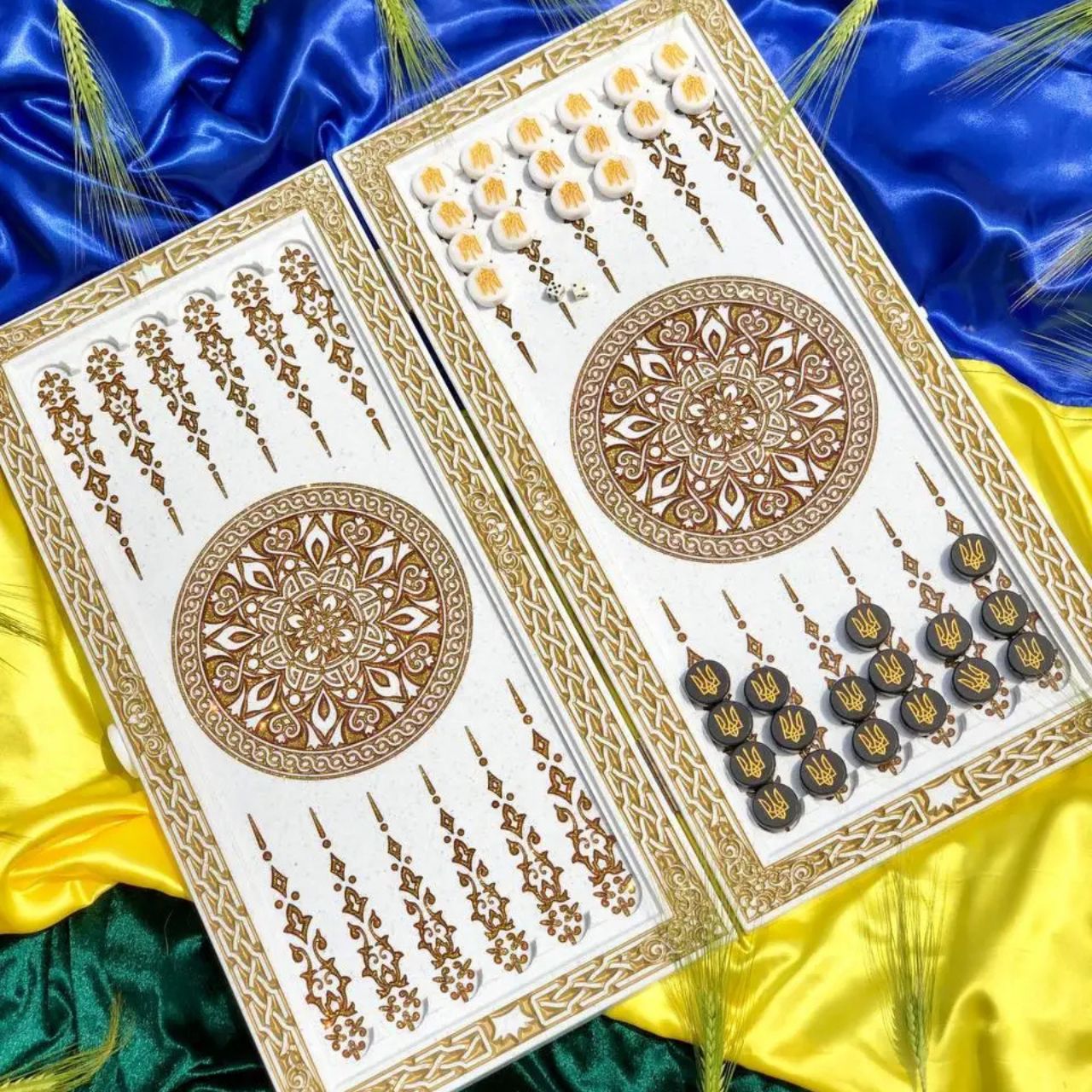 Патриотические нарды из белого камня Трезубец 58×28×5см