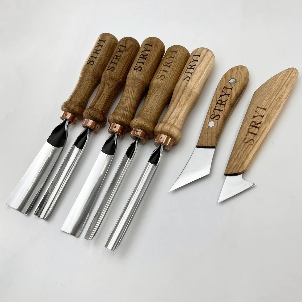 Базовый набор инструментов для резьбы по дереву STRYI, 7 предметов — резцы и стамески для художественной и рельефной резьбы Базовый набор инструментов для резьбы по дереву STRYI из 7 предметов — это универсальный профессиональный ручной инструмент для художественной резьбы небольших фигурок из мягкой и жесткой древесины. Набор оптимально подходит как для начинающих, так и для опытных резчиков, которым важна точность, контроль и стабильный результат. Комплектация подобрана так, чтобы перекрыть все базовые потребности в резьбе по дереву. Резьбовые ножи позволяют выполнять точные резы, зачистку и работу по стружке, V-образный резец идеально подходит для глубоких надрезов, контуров, перьев, волос и декоративных линий, а профильные стамески различной кривизны и ширины обеспечивают эффективную выборку материала, формирование рельефа и обработки вогнутых форм. Инструменты изготовлены из высококачественной углеродистой стали У8 с твердостью 60–62 HRC, что гарантирует долгое удержание остроты, чистый рез без сколов и стабильную работу по любым породам древесины. Толщина металла 2 мм обеспечивает оптимальный баланс между прочностью и управляемостью. Дубовые ручки, отделанные натуральным льняным маслом, удобно лежат в руке, не скользят и позволяют комфортно работать даже во время продолжительных сессий. Общая длина инструментов – 220 мм – идеальна для точного ручного контроля. Этот набор резцов по дереву станет надежным основанием для обучения резьбе, художественным и рельефным работам, созданию декоративных панно, барельефов и объемных элементов. Подойдет для резьбы по дереву дома, в мастерской или учебном процессе. Все инструменты поставляются в удобном футляре для хранения и транспортировки. STRYI — украинский производитель профессионального инструмента для резьбы по дереву с более чем 10-летним опытом. Компания постоянно совершенствует производство, повышает качество стали и эргономику инструментов, а также предоставляет полное сопровождение резчикам: консультации, широкий ассортимент инструментов, материалы и обучение. Заказывая этот набор, вы получаете инструмент непосредственно от производителя без посредников, с гарантированным качеством и поддержкой. ???? Комплектация (7 предметов) Нож для резьбы по дереву 30°, 40 мм - арт. 183040 Нож для резьбы по стружке 45°, 35 мм – арт. 184535 V-образный резец 90°, 5 мм - арт. 109005 Стамеска профиль №5 - 20 мм, ст. 100520 Стамеска профиль №9 - 15 мм, ст. 100915 Стамеска профиль №8 - 10 мм, ст. 100810 Стамеска профиль №7 - 25 мм, ст. 100725 Чехол для хранения Гарантийное обслуживание – весь период эксплуатации инструмента (минимальный период эксплуатации 20 лет) Контроль каждого процесса производства STRYI, а особенно правильная термообработка обеспечивает длительный срок службы инструмента без частой дополнительной перезаточки в процессе работы." Также обращаем Ваше внимание, что STRYI является единственным производителем заточка или переточка инструмента) Наличие профессиональной заточки при покупке инструмента позволяет сразу приступить к работе с любого вида дерева, а удобная форма рукоятки убережет руки от усталости в процессе длительного использования. Сделав покупку у нас, Вы получаете: STRYI, Вы всегда можете рассчитывать на помощь и консультацию. Наши консультанты помогут Вам с выбором инструмента, а также всегда уч