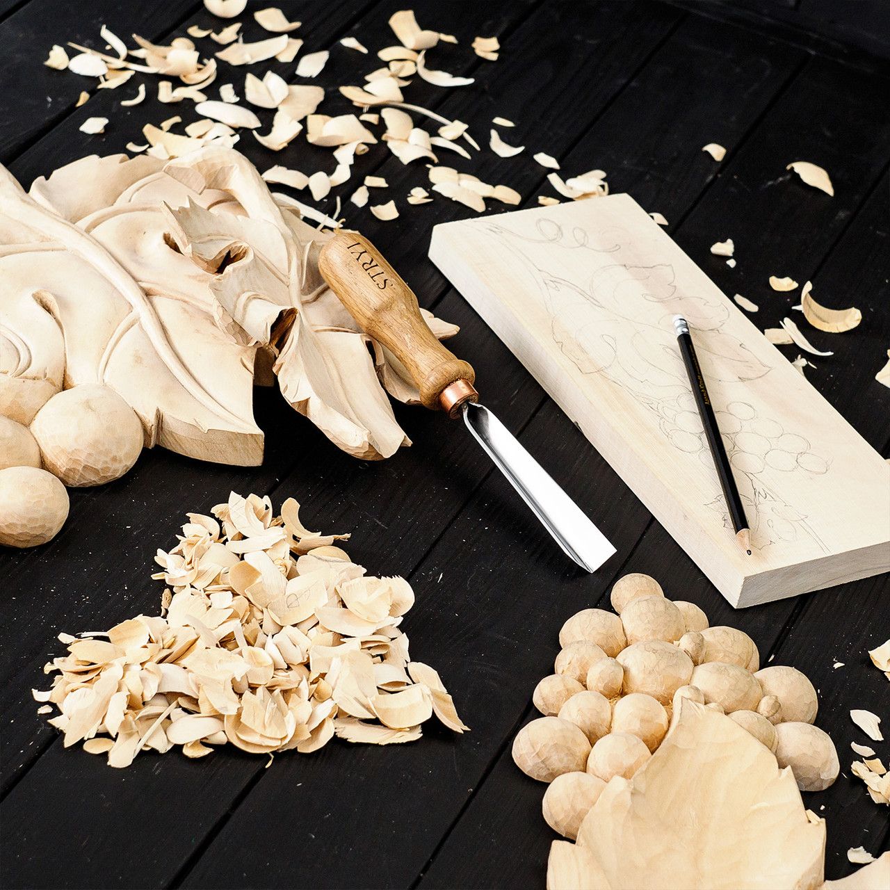Набор для вырезания культи из дерева STRYI — 3 инструмента и заготовка из липы.