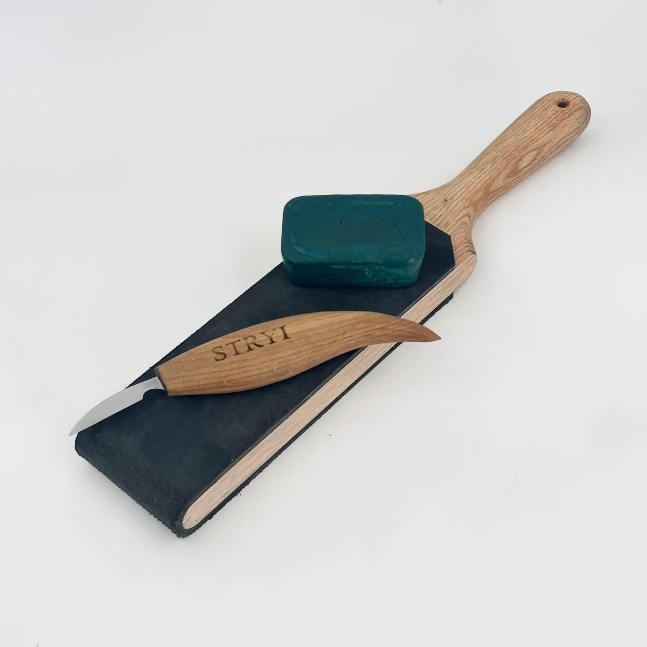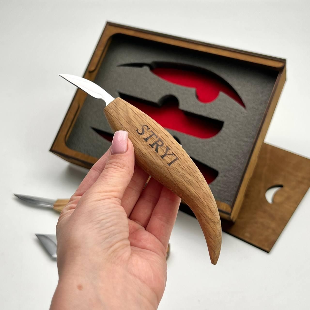 Набор для вырезания культи из дерева STRYI — 3 инструмента и заготовка из липы.