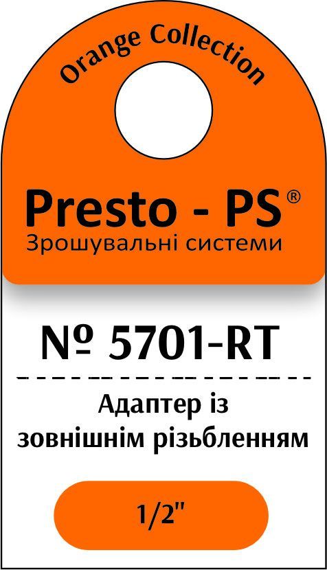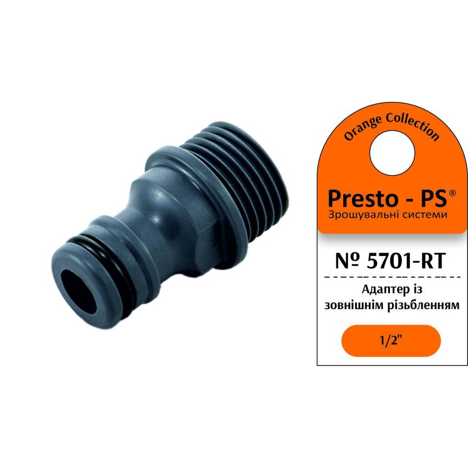 Адаптер під конектор Presto-PS (5701-RT) застосовують у комбінації зі швидкоз'ємними конекторами, кранами або трійниками з внутрішнім різьбленням 1/2 дюйма для під'єднання садових шлангів різних діаметрів до системи водопостачання. Робочий тиск до 4 атмосфер. Виготовляється адаптер з якісного пластику, стійкого до механічних навантажень, дії розчинів добрив і ультрафіолетового випромінювання.