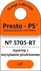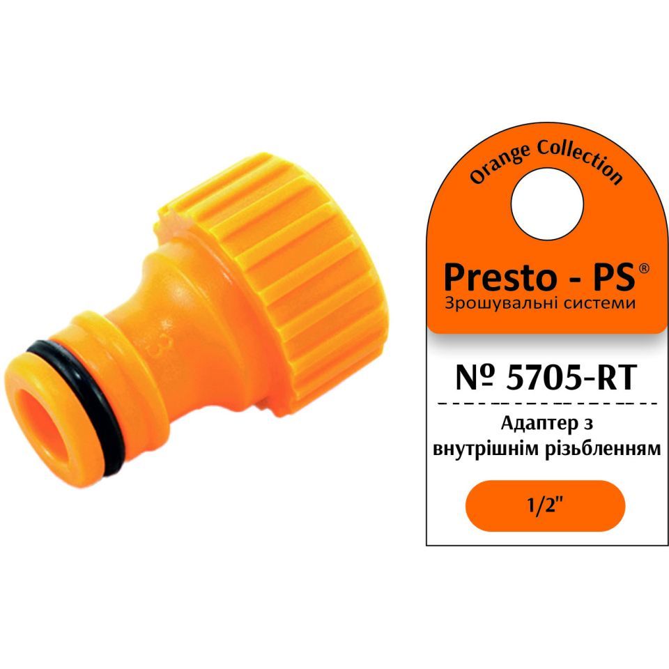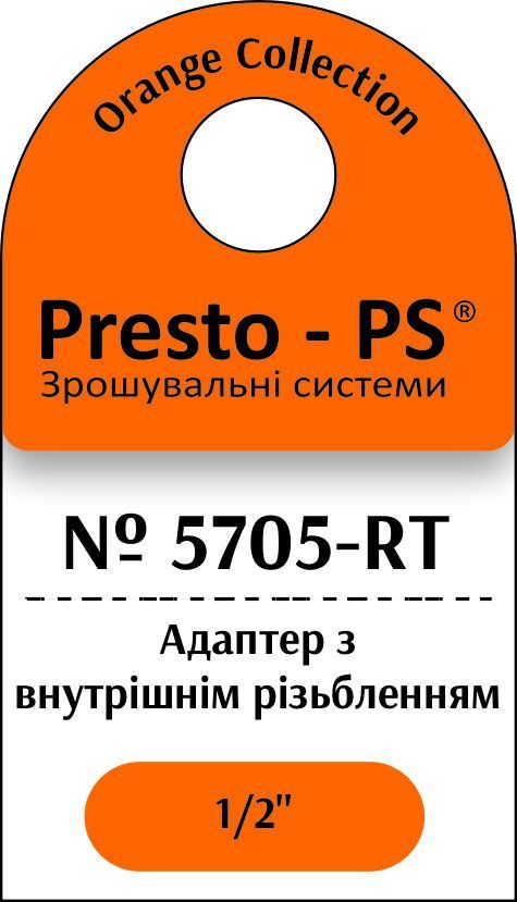 Адаптер під конектор Presto-PS (5705-RT) застосовують у комбінації зі швидкознімними конекторами, кранами або трійниками із зовнішнім різьбленням 1/2 дюйма для під'єднання садових шлангів різних діаметрів до системи водопостачання. Робочий тиск до 4 атмосфер. Виготовляється адаптер з якісного пластику, стійкого до механічних навантажень, дії розчинів добрив і ультрафіолетового випромінювання.