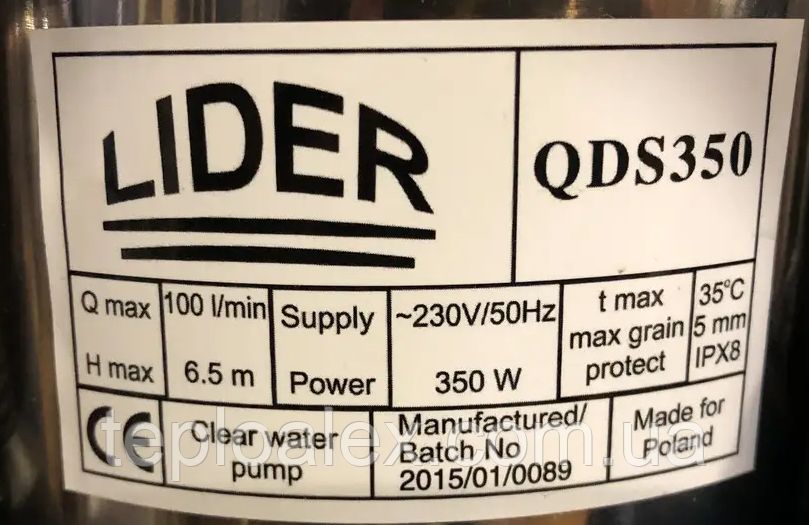 Насос дренажный Lider QDS 350 Вт из нержавейки с медной обмоткой двигателя 0,35 кВт