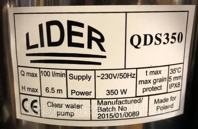 Насос дренажный Lider QDS 750 Вт из нержавейки с медной обмоткой двигателя 0,75 кВт