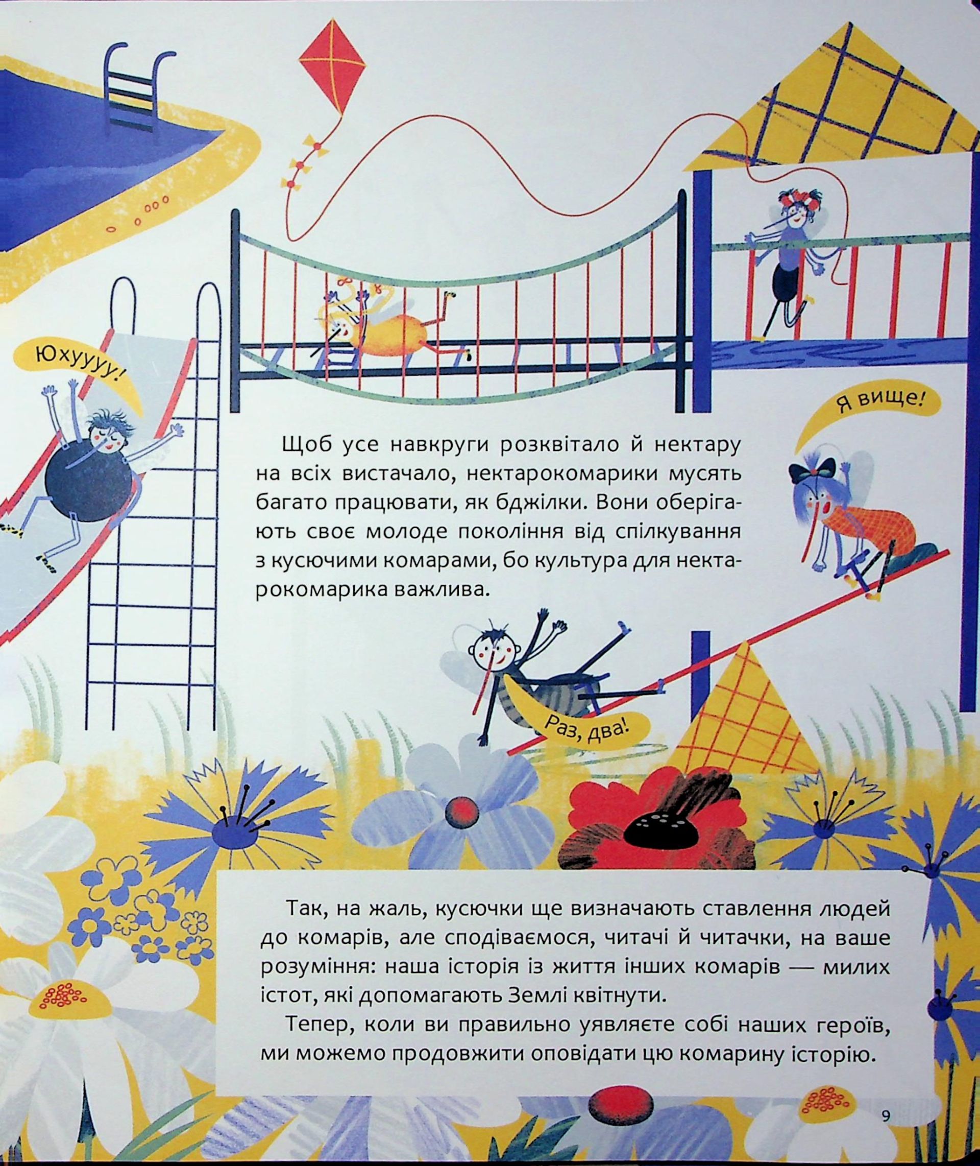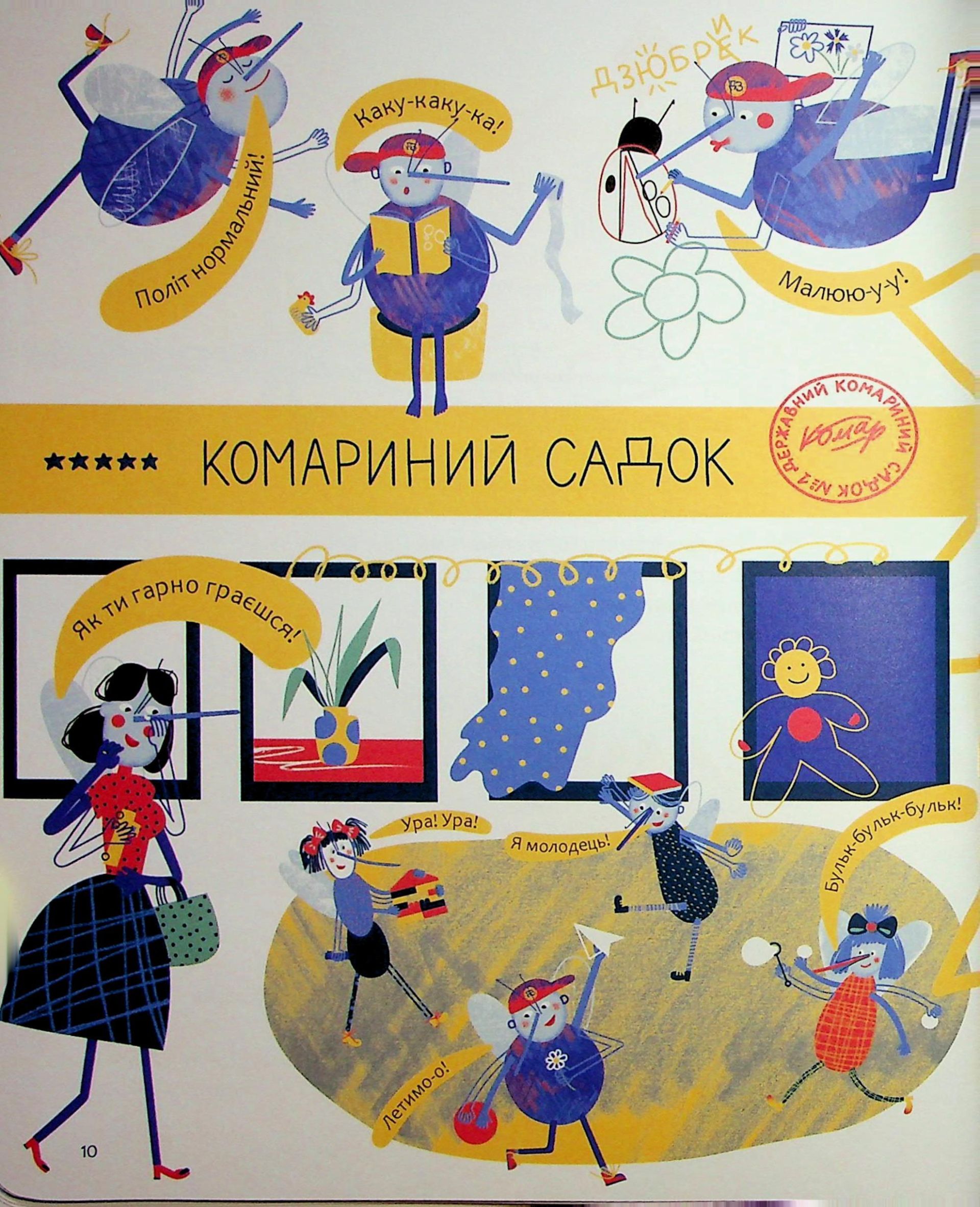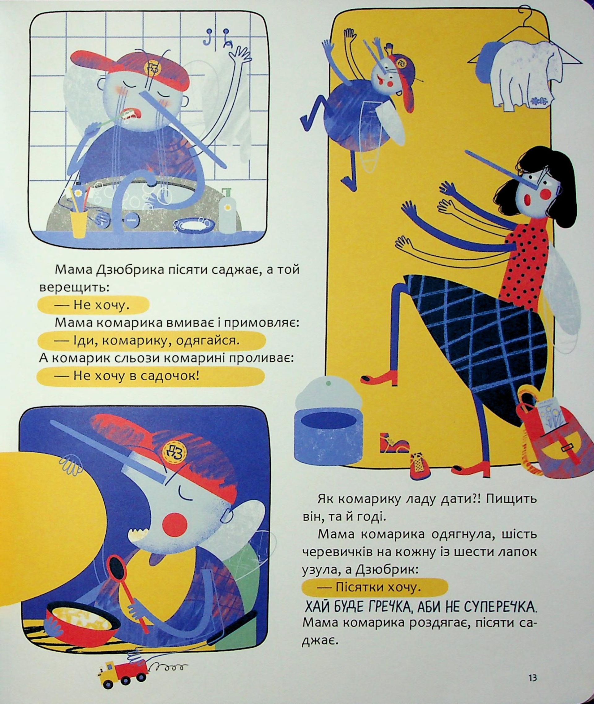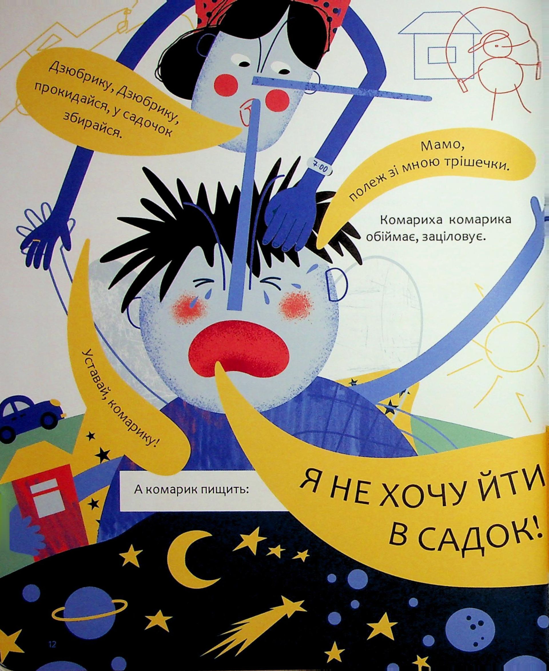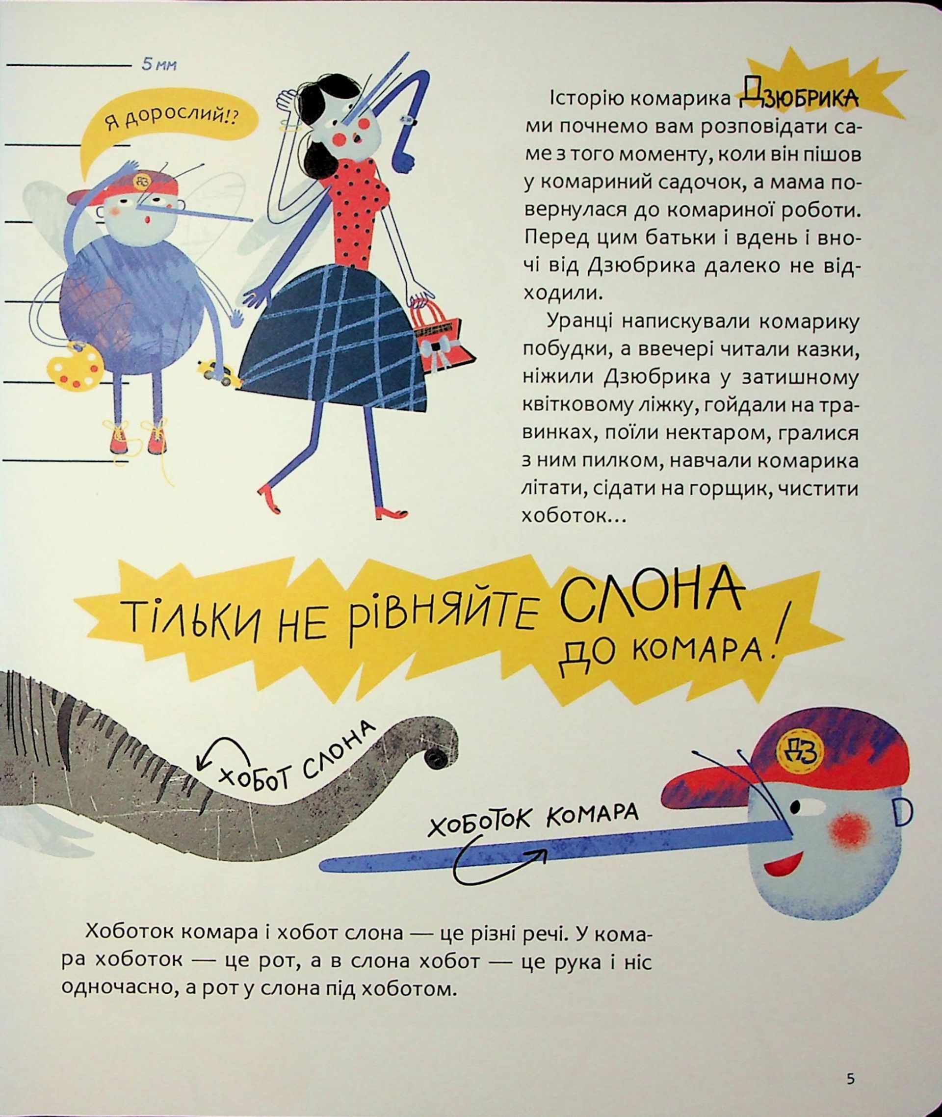 Комарик Дзюбрик, с одной стороны, радуется, что будет играть с другими детьми-комариками, а с другой его пугает перспектива остаться без мамы, потому что он еще не чувствует себя готовым к такому. Выбор главным героем книги именно комарика интересен и неожидан. Это может подтолкнуть ребенка к исследованию мира насекомых, к которому именно в раннем возрасте малыши и так проявляют любопытство. Украинские поговорки, которыми пересыпан рассказ, проведут ребенка в мир украинской народной культуры и помогут с развитием речи, ведь в возрасте 3-4 лет ребенку нравится повторять слова и предложения с рифмой.