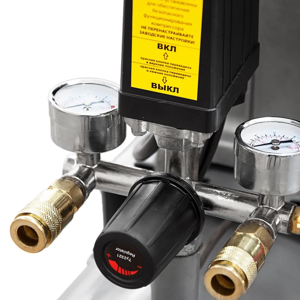 Компрессор двухцилиндровый ременной 2.5кВт 335л/мин 10бар 50л (2 крана) SIGMA (7044121) предназначен для нагнетания сжатого воздуха с последующей его подачей под давлением в различные типы пневмоинструмента и пневмооборудования. Ременной привод компрессора закрыт металлическим кожухом, который предотвращает от попадания посторонних предметов. Опорная ножка обеспечивает устойчивое положение на поверхности, а резиновая подушечка снижает уровень вибрации. Модель компрессора Sigma 7044121 обладает мощностью 2.5 кВт и большой производительностью 335 л/мин с высоким давлением (до 10 бар). Данная модель спроектирована для профессионального применения. Применяется в строительстве и небольшом производстве, на СТО и мастерских. Ресивер емкостью 50 л позволяет накапливать больший объем сжатого воздуха, что значительно уменьшает частоту включения двигателя, снижая нагрузку на компрессор и, соответственно, увеличивает срок его службы. Особенности: Установлены обратный и предохранительный клапаны Удобно расположенная пробка позволяет легко и быстро слить конденсат из ресивера Установлены два универсальных быстроразъемных латунных коннектора диаметром 1/4" Два манометра позволяют контролировать давление внутри ресивера и давление на выходе Регулируемое рабочее давление Ременной привод защищен металлическим кожухом Высокопрочный ресивер Низкий уровень вибрации и шума Простота транспортировки