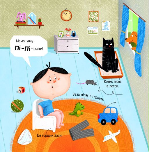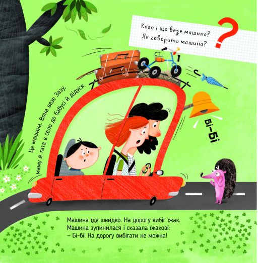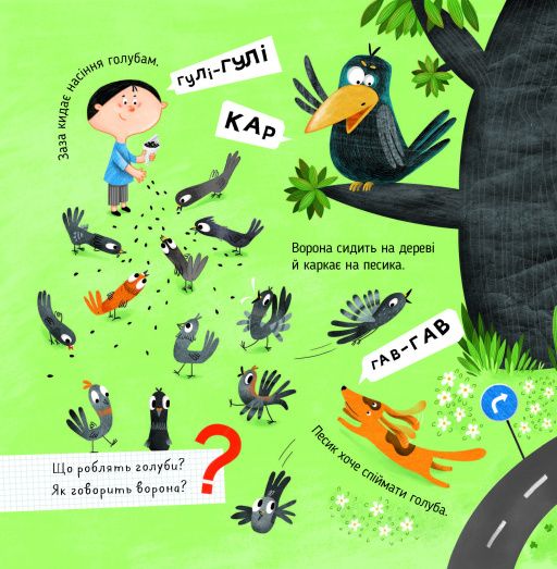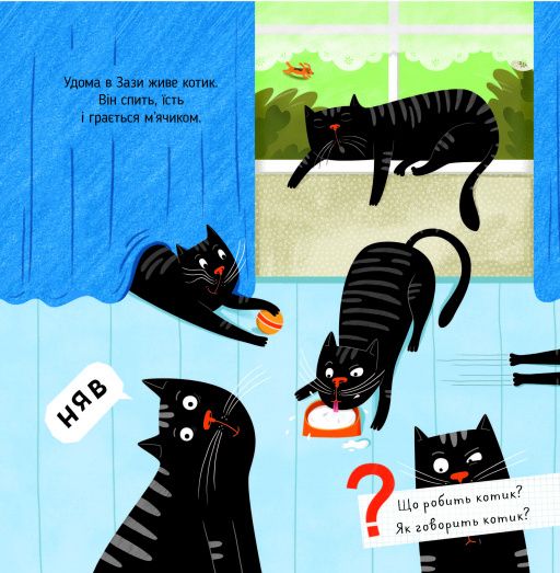 Мы не можем сказать наверняка, потому что это индивидуально. Но точно знаем, как ребенок учится говорить: из-за звукоподражания. И эта книга ей поможет. Но она содержит не просто звуки, которые можно подражать, а еще и маленькие истории. С этой книгой ребенок радуется, повторяя звуки за животными, и в то же время наблюдает актуальные для него ситуации. Издание способствует развитию речи на четырех уровнях. На первом уровне ребенок повторяет, как говорят животные, на втором – рассказывает, что делают животные. На третьем уровне родители, проговаривая названия объектов и издаваемые ими звуки, указывают на выделенный на страницах текст — и ребенок запоминает, как слова записываются буквами. Четвертый уровень – это первое чтение. На этом этапе важно, что ребенок уже знает начертание всех слов в книге и разбирает их по буквам, таким образом нарабатывая привычку воспроизводить звуки, обозначенные буквами, а впоследствии — и совмещать их. Использованные звуки и слова: ма-ма, та-то, я, Заза, мяу, гав, кар, му, ква-ква, га-га-га, ко-ко, ням-ням, бабушка, дедушка, пи-пи, би-би, гули-гули, ну-ну, бульк, хлюп, ну.