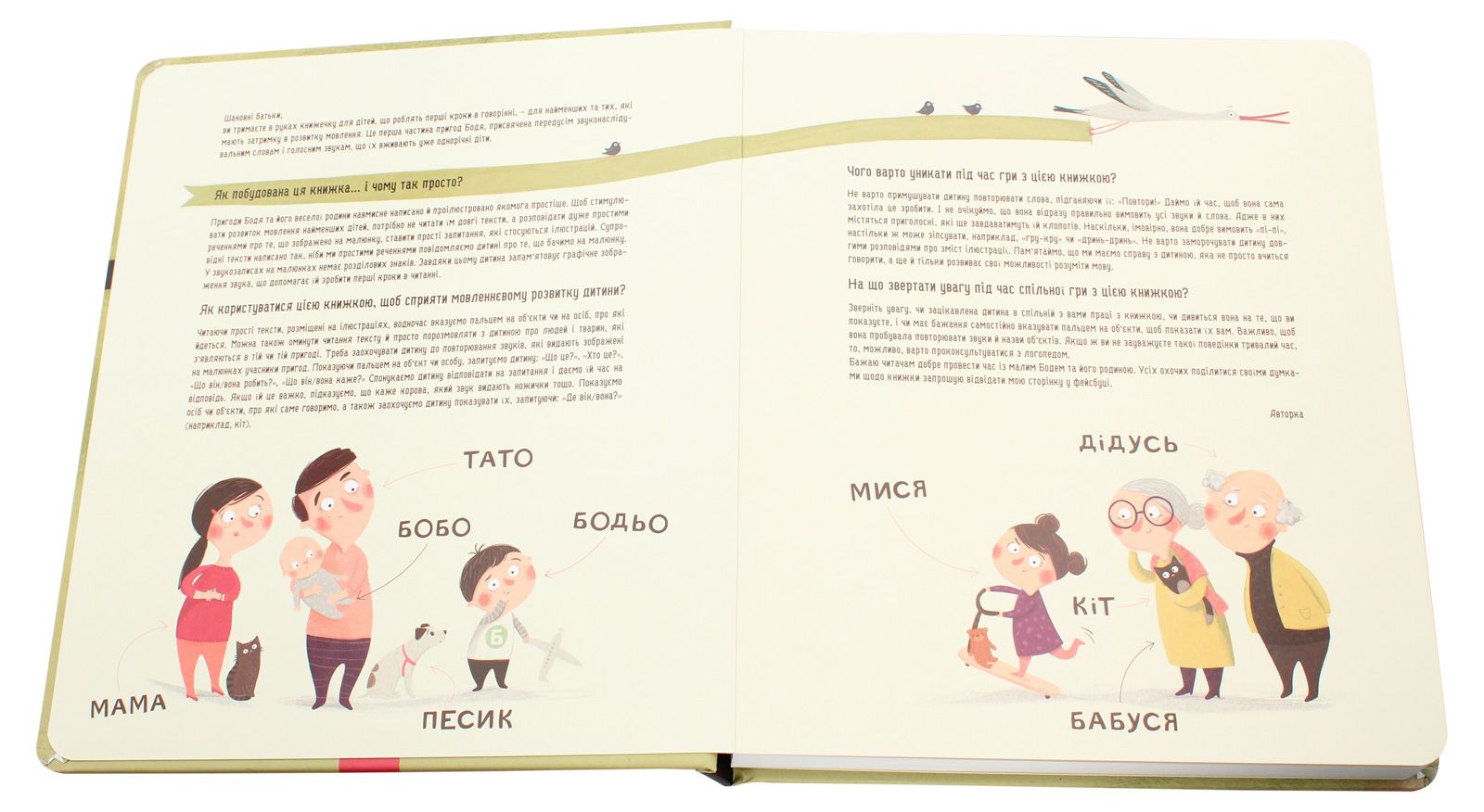 Книга издает звуки голосом чтеца, так что родители должны принять участие в ее чтении с ребенком. Когда ребенок начинает говорить: в 6, 10, 11 или 18 месяцев? Мы не можем сказать наверняка, потому что это индивидуально. Но точно знаем, как ребенок учится говорить: из-за звукоподражания. И эта книга ей поможет. Но она содержит не просто звуки, которые можно подражать, а еще и маленькие истории. С этой книгой ребенок радуется, повторяя звуки за животными, и в то же время наблюдает актуальные для него ситуации. Издание способствует развитию речи на четырех уровнях. На первом уровне ребенок повторяет, как говорят животные, на втором – рассказывает, что делают животные. На третьем уровне родители, проговаривая названия объектов и издаваемые ими звуки, указывают на выделенный на страницах текст — и ребенок запоминает, как слова записываются буквами. Четвертый уровень – это первое чтение. На этом этапе важно, что ребенок уже знает начертание всех слов в книге и разбирает их по буквам, таким образом нарабатывая привычку воспроизводить звуки, обозначенные буквами, а впоследствии — и совмещать их. Использованные звуки и слова: ма-ма, та-то, я, Заза, мяу, гав, кар, му, ква-ква, га-га-га, ко-ко, ням-ням, бабушка, дедушка, пи-пи, би-би, гули-гули, ну-ну, бульк, хлюп, ну.