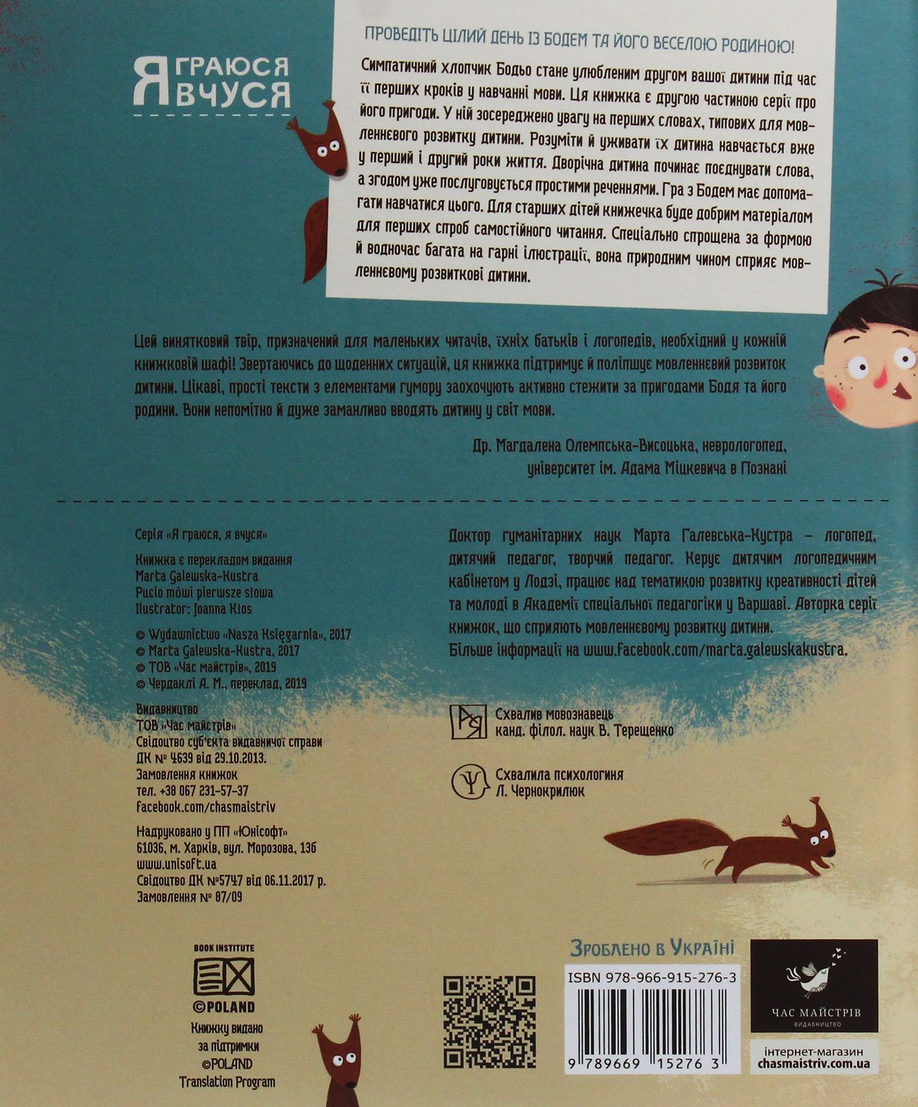 Симпатичный мальчик Бодьо станет любимым товарищем вашего ребенка во время его первых шагов в обучении языку. Эта книга является первой частью серии о его приключениях. В ней сосредоточено внимание прежде всего на звукоподражательных словах и громких звуках, которые произносят уже годовалые дети. Издание также рекомендовано для работы с несколько старшими детьми, задерживающимися в развитии речи. Специально упрощенная по форме и в то же время богатая красивыми иллюстрациями, поощряющими называть объекты и повторять звуки, книга естественным образом способствует речевому развитию ребенка. Автор книги Марта Галевская-Кустра - логопед, детский педагог, творческий педагог.
